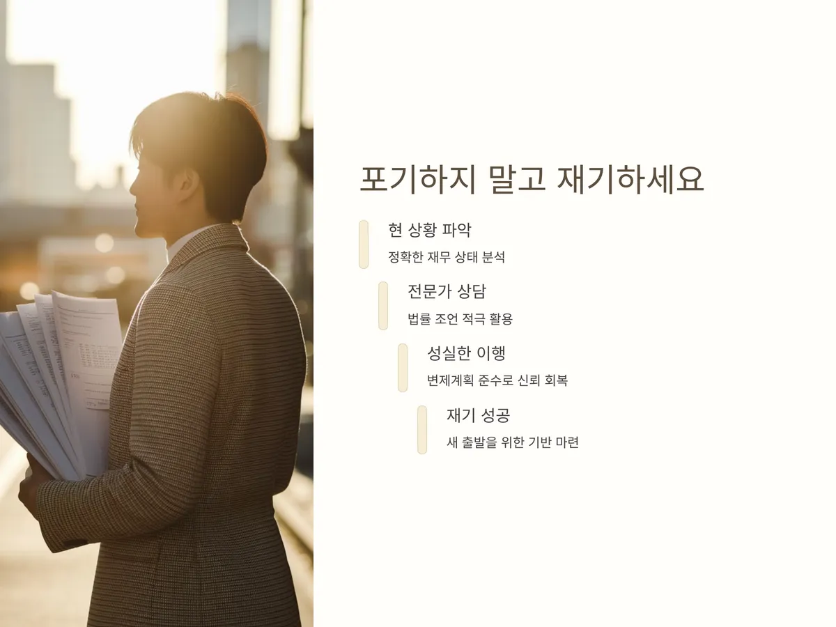 또한 미납 발생 즉시 법원에 '변제계획 변경 신청'이나 '납부 유예 요청'을 할 수 있습니다. 단, 해당 신청이 수용되려면 미납 사유가 불가항력적이어야 하며, 향후 납부 계획이 현실적이어야 합니다. 한 번의 실수로 모든 기회를 잃지 않도록 신속하고 성실한 대응이 필요합니다.
