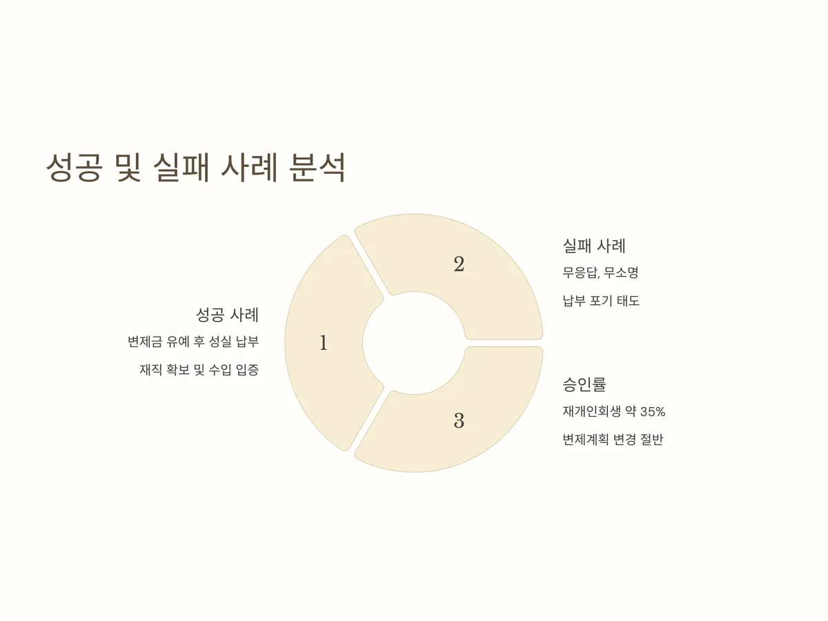 성공 사례에서는 변제금 유예를 요청한 후 성실히 납부를 재개하거나, 재직을 다시 확보하고 수입 구조를 입증한 경우가 많습니다. 반면 실패 사례는 대부분 무응답, 무소명, 납부 포기 태도로 일관하여 법원이 성실성 자체를 의심하게 되는 경우였습니다.