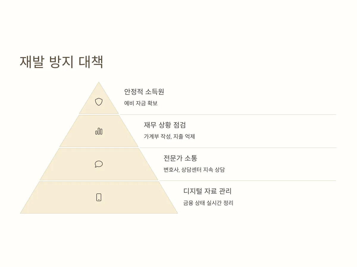 재 개인회생 도중 변제금 미납을 방지하려면 첫째, 안정적인 소득원을 마련하고 예비 자금을 확보하는 것이 필수입니다. 둘째, 재무 상황의 주기적인 점검과 가계부 작성, 불필요한 지출 억제가 병행되어야 합니다. 셋째, 회생절차 중 전문 변호사 또는 상담센터와의 지속적 소통으로 유사시 대응력을 높여야 합니다.