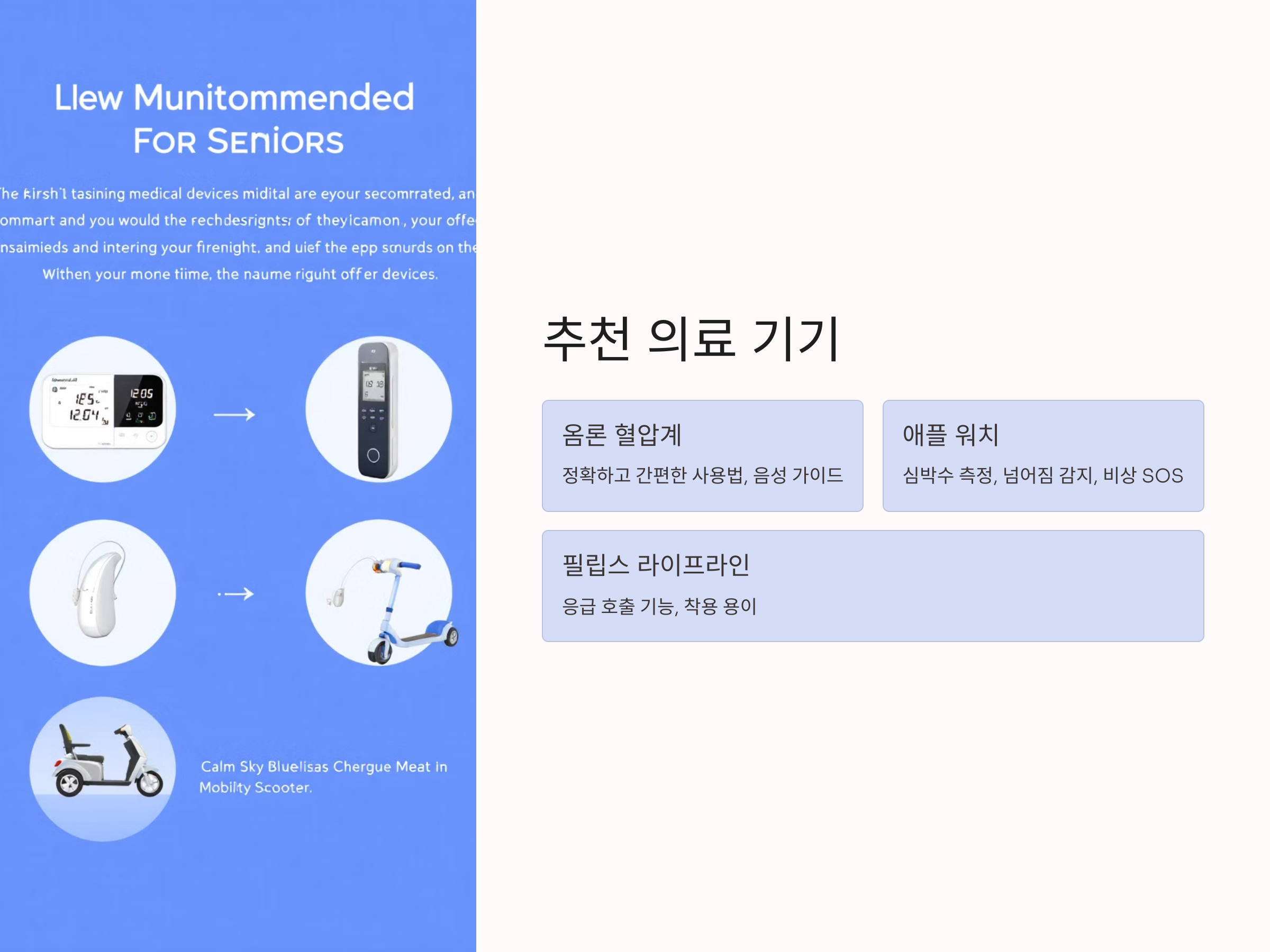 시니어를 위한 의료 기기는 고령자의 신체적, 정신적 요구를 충족시키는 데 초점이 맞춰져 있습니다. 기기의 선택은 건강 상태, 독립성 수준, 그리고 일상 생활에서의 필요에 따라 달라집니다.