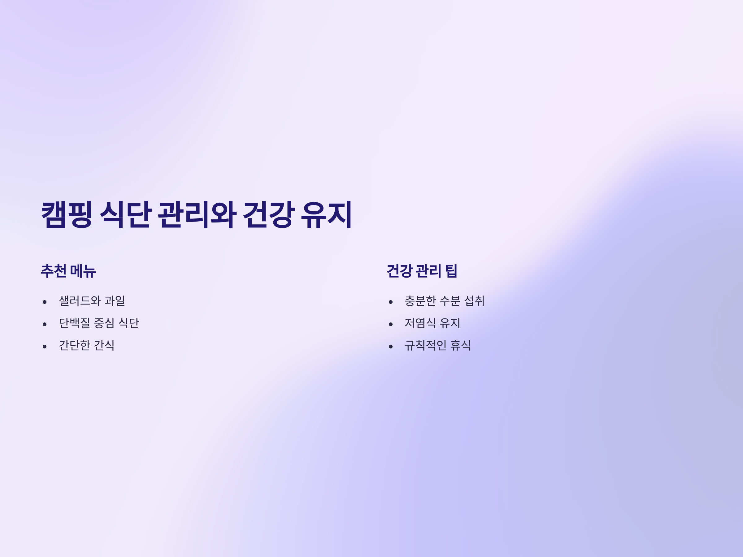 - 캠핑 중 규칙적인 운동과 휴식을 통해 균형을 유지.