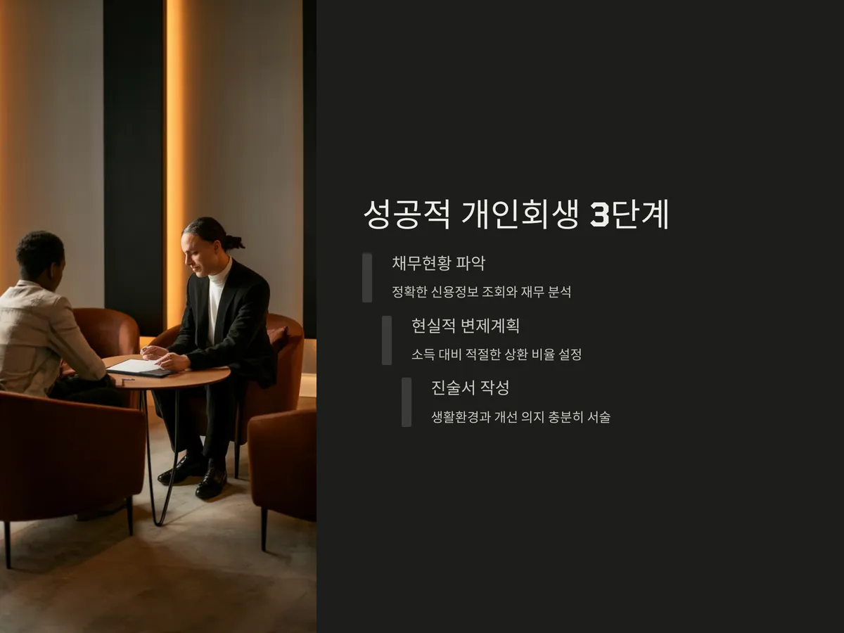 성공적인 개인회생을 위해서는 3단계 준비가 핵심입니다. 첫째, 정확한 채무현황 파악과 신용정보 조회로 자신의 현재 재무 상태를 정밀 분석해야 합니다. 둘째, 변제계획안을 현실적으로 구성해 소득 대비 상환 비율이 과도하지 않도록 해야 하며, 셋째, 진술서 작성 시 자신의 생활환경과 향후 개선 의지를 충분히 서술해야 합니다.