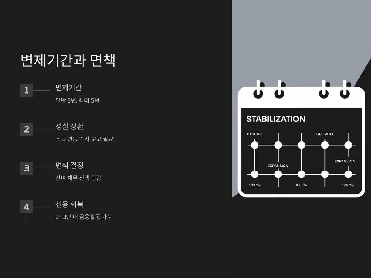 개인회생 변제기간은 일반적으로 3년이지만 상황에 따라 5년까지 연장될 수 있습니다. 중요한 점은 이 기간 동안 성실하게 상환을 해야 하고, 소득이 증가한 경우 법원에 즉시 보고해야 한다는 점입니다. 반면, 생계 유지가 어려울 정도의 수입 감소가 발생한 경우에는 법원에 감면 요청을 할 수 있습니다.