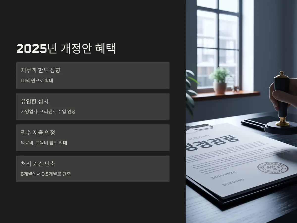 2025년 들어 적용된 개정안은 채무자 입장에서 상당히 긍정적인 변화입니다. 대표적으로 총 채무액 한도가 10억 원으로 상향되었고, 자영업자나 프리랜서 등의 수입 불규칙자에 대한 심사가 유연해졌습니다. 특히 의료비, 교육비 등 필수 지출 항목을 인정하는 범위가 확대되어 실질적인 부담을 줄이는 데 도움이 되고 있습니다.