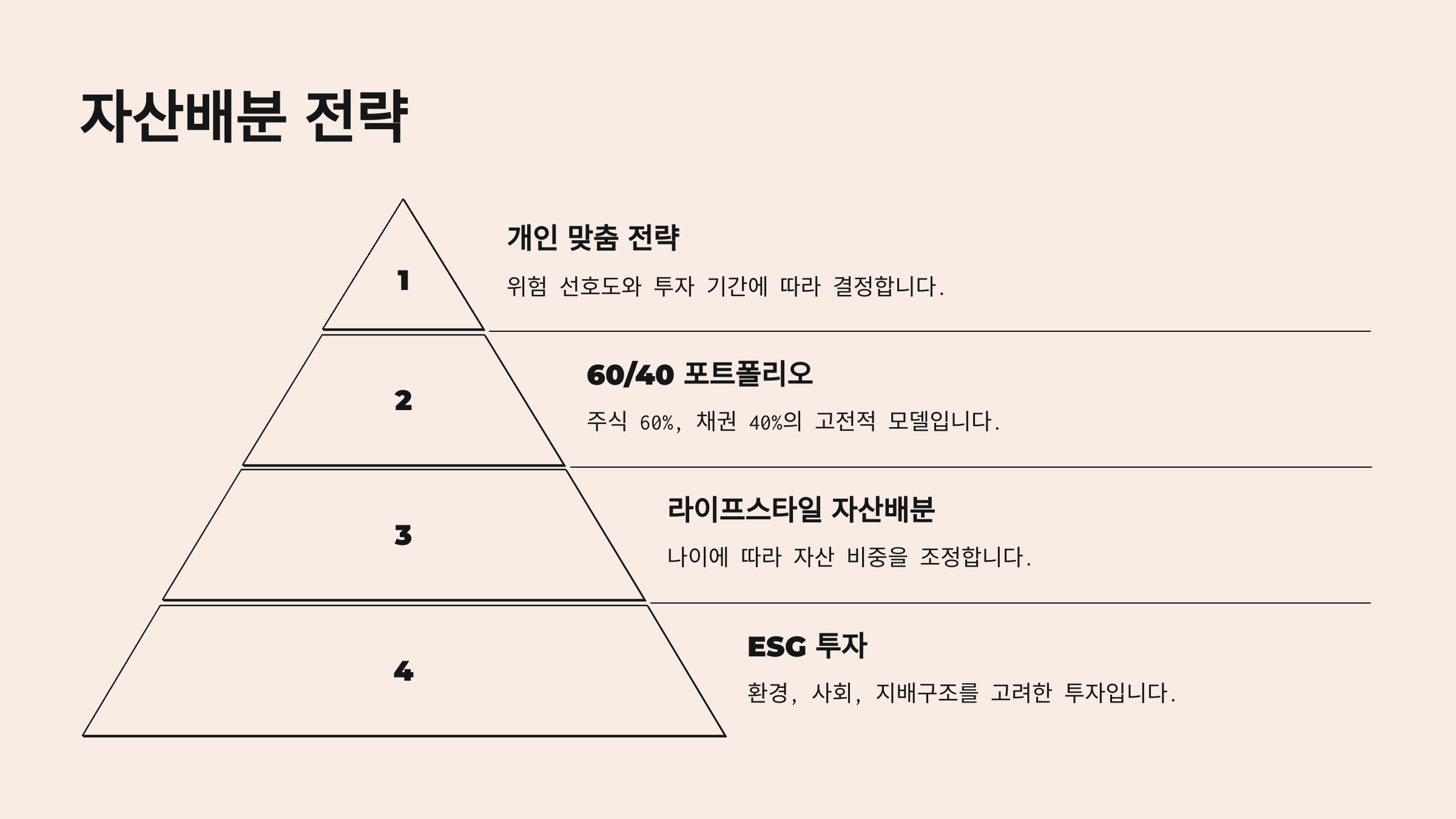 - 라이프스타일 자산배분: 나이에 따라 자산 배분을 조정하며, 젊을수록 공격적인 주식 비중을, 나이가 들수록 보수적인 채권 비중을 늘립니다.