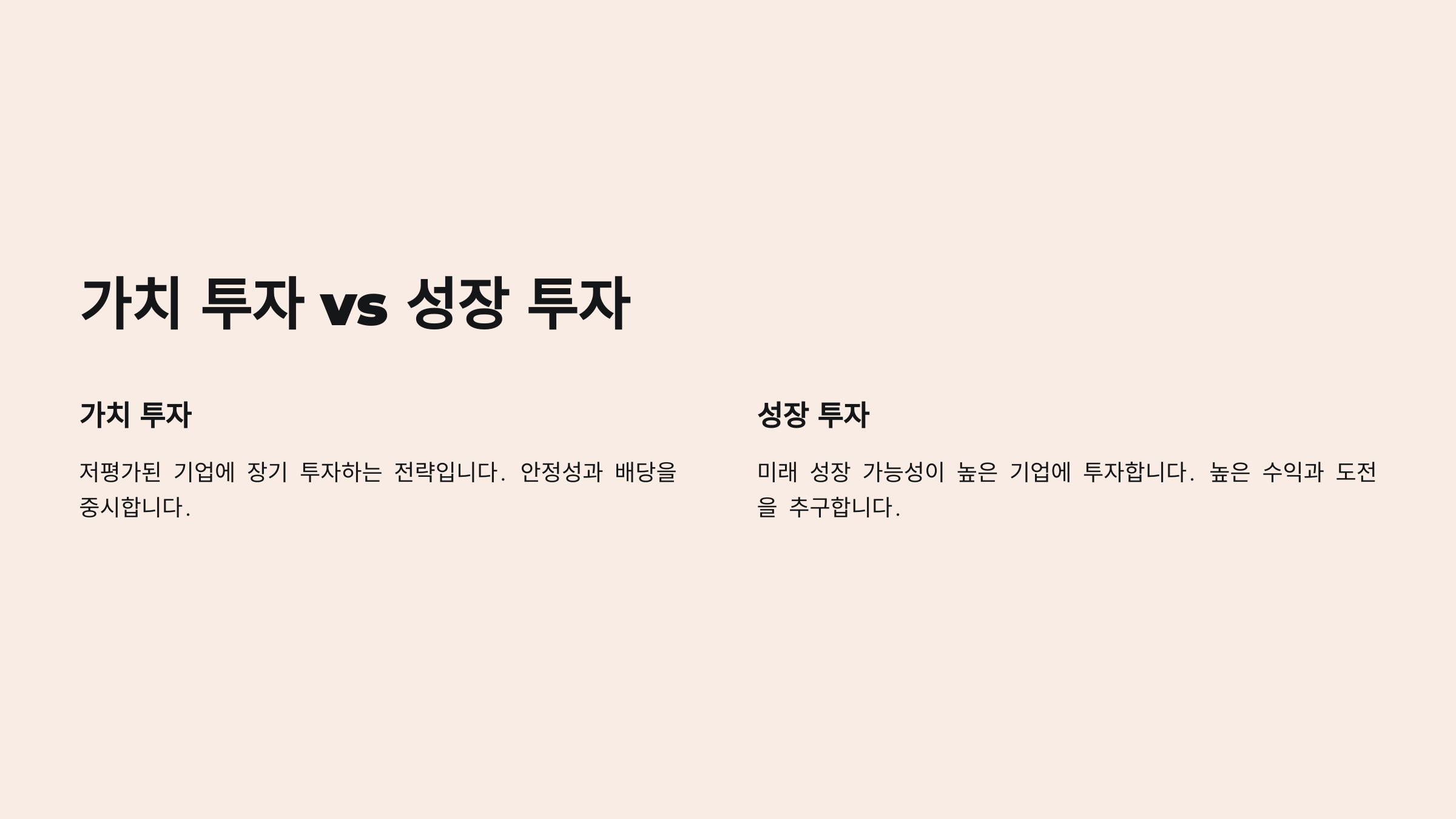 - 안정성과 배당을 중시한다면 가치 투자를, 높은 수익 가능성과 도전을 원한다면 성장 투자를 고려하세요.