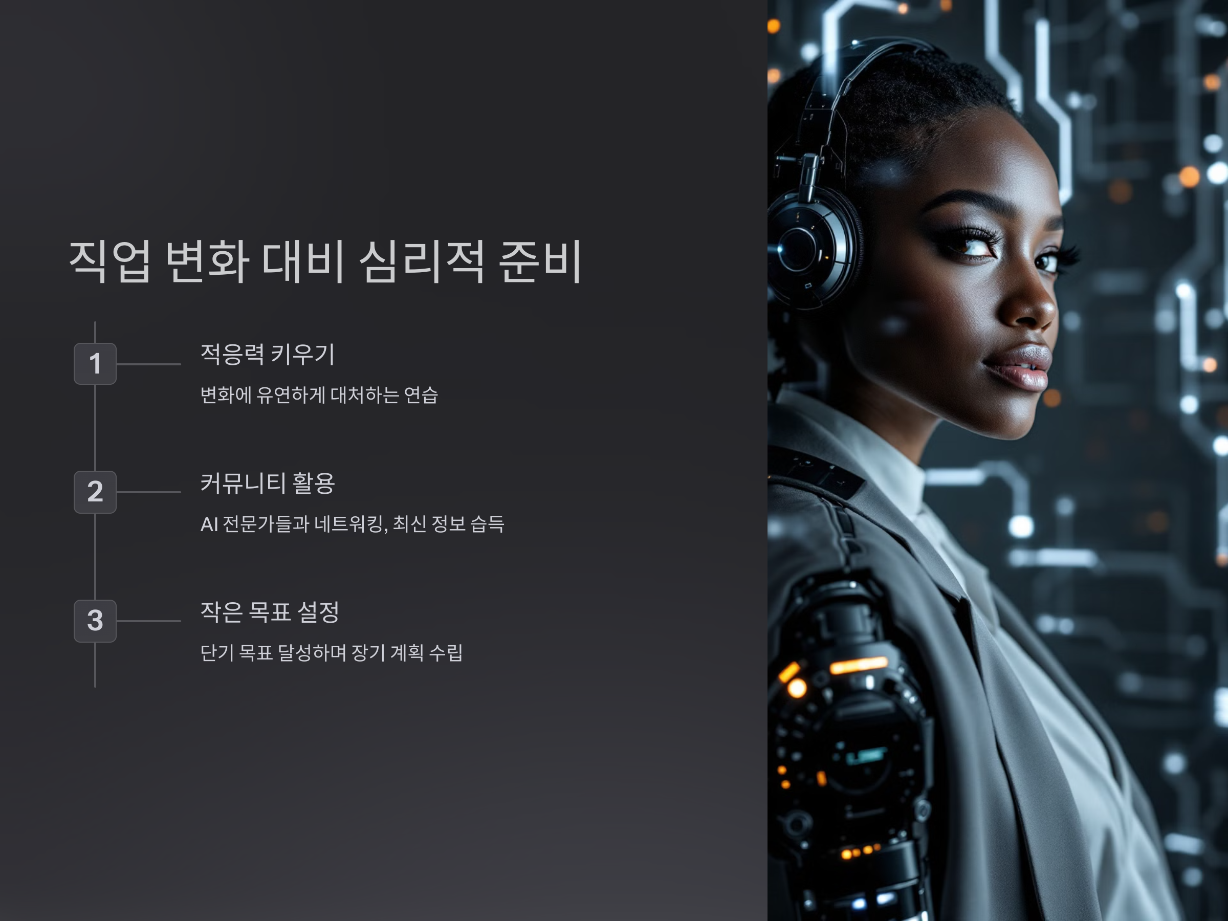 변화의 시대에 심리적 준비는 필수입니다. AI로 인한 변화는 불안을 동반할 수 있지만, 이를 긍정적으로 받아들이고 대비한다면 성공적인 전환이 가능합니다.