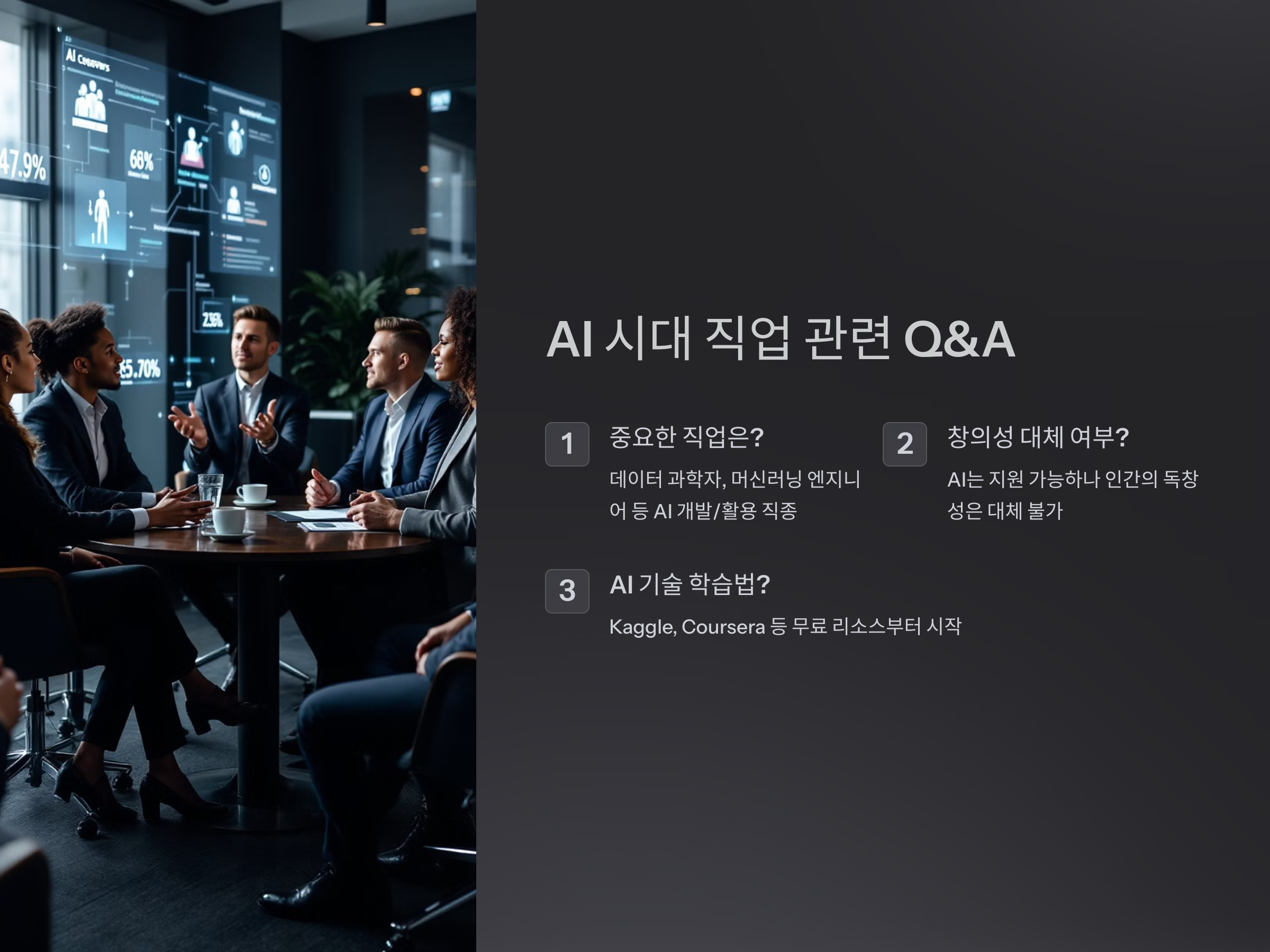 AI 시대에 대비하려면 변화에 대한 이해와 기술 학습, 심리적 준비가 필수입니다. 기술의 발전은 위협이 아니라 기회가 될 수 있습니다. 더 나은 커리어를 위해 지금부터 준비하세요.
