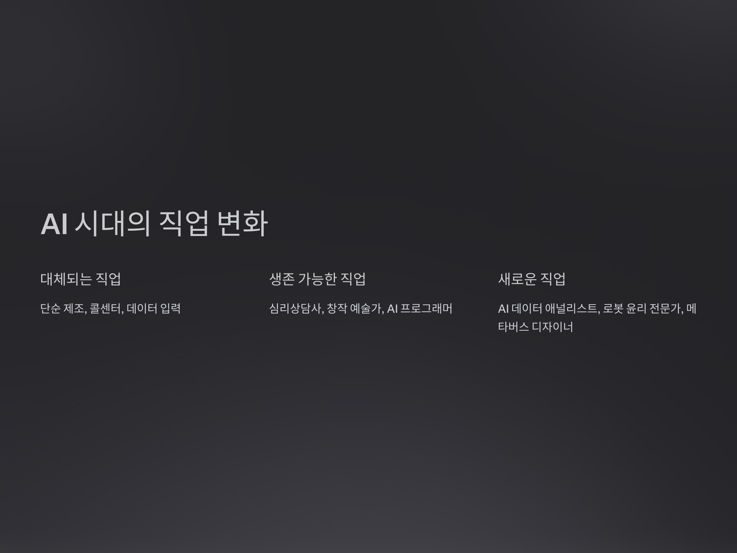 - 대체되는 직업: 단순 제조, 콜센터, 데이터 입력 등