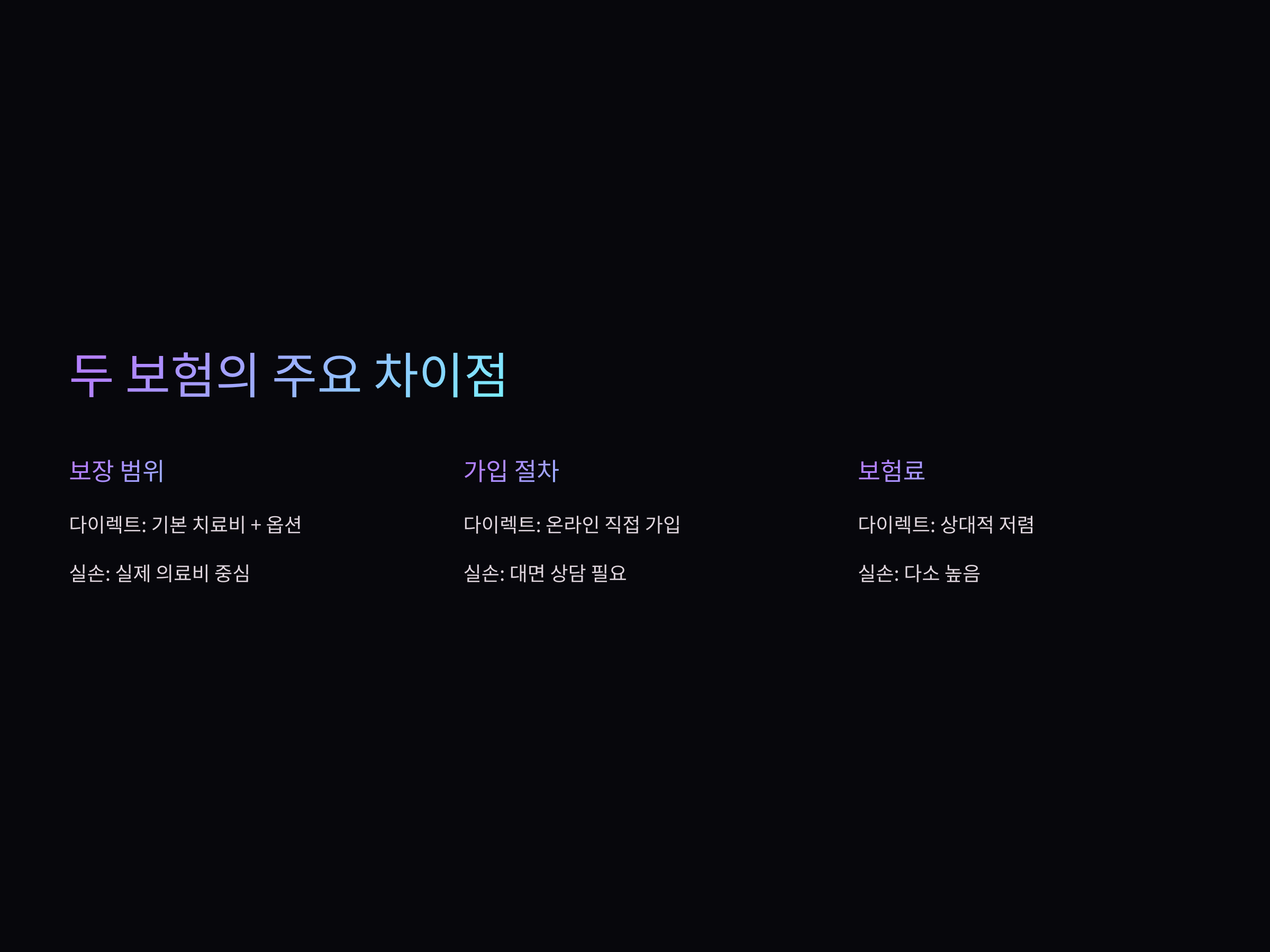 - 보험료: 대면 상담이나 설계사가 없기 때문에 중개 수수료가 제외되어, 상대적으로 저렴한 보험료를 제공할 수 있습니다.