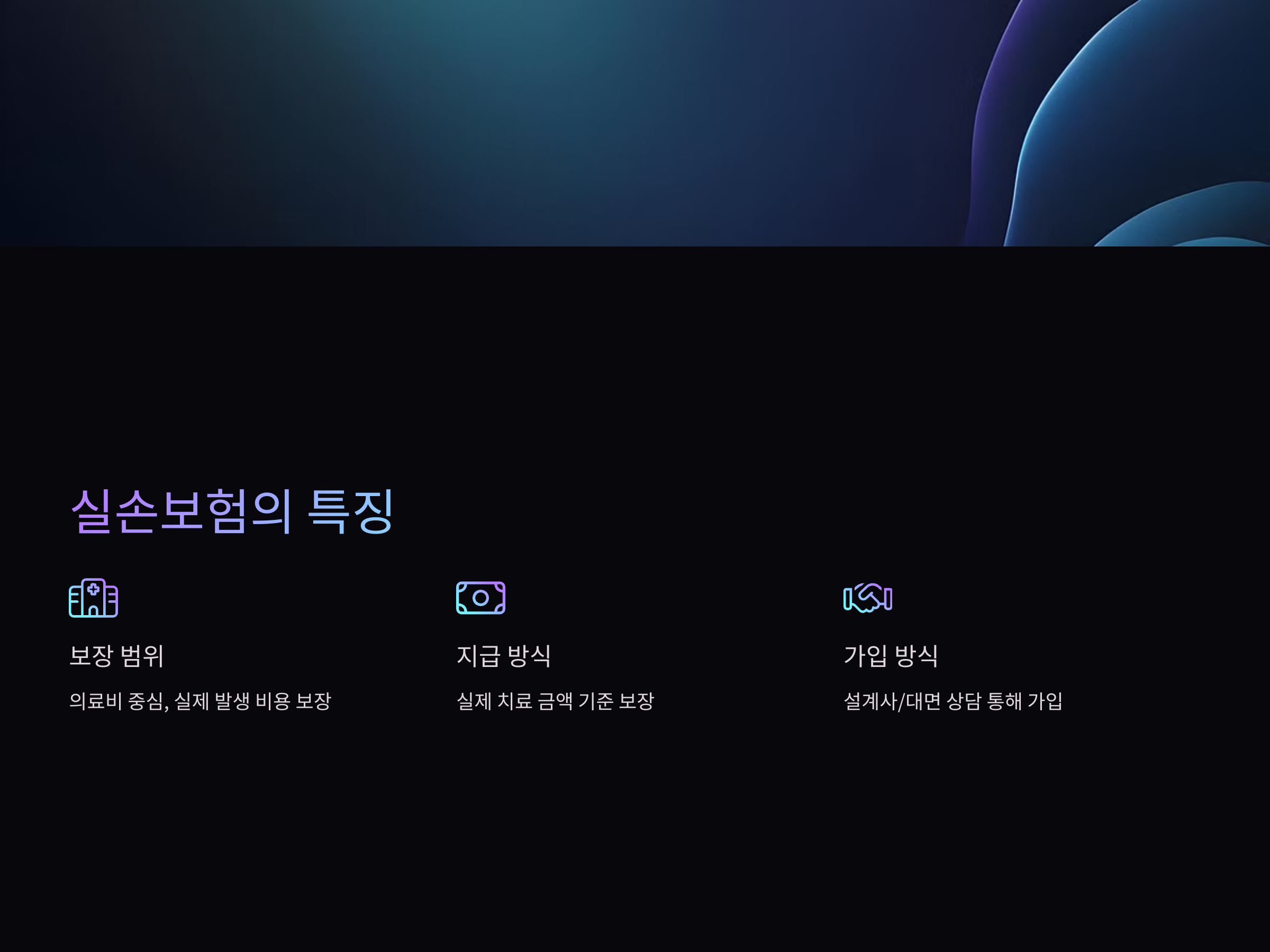 - 실손보험은 입원비, 수술비 등 실제로 발생한 의료비를 보장하는 데 초점을 맞추고 있습니다. 의료비를 실비로 보장받을 수 있는 장점이 있습니다.
