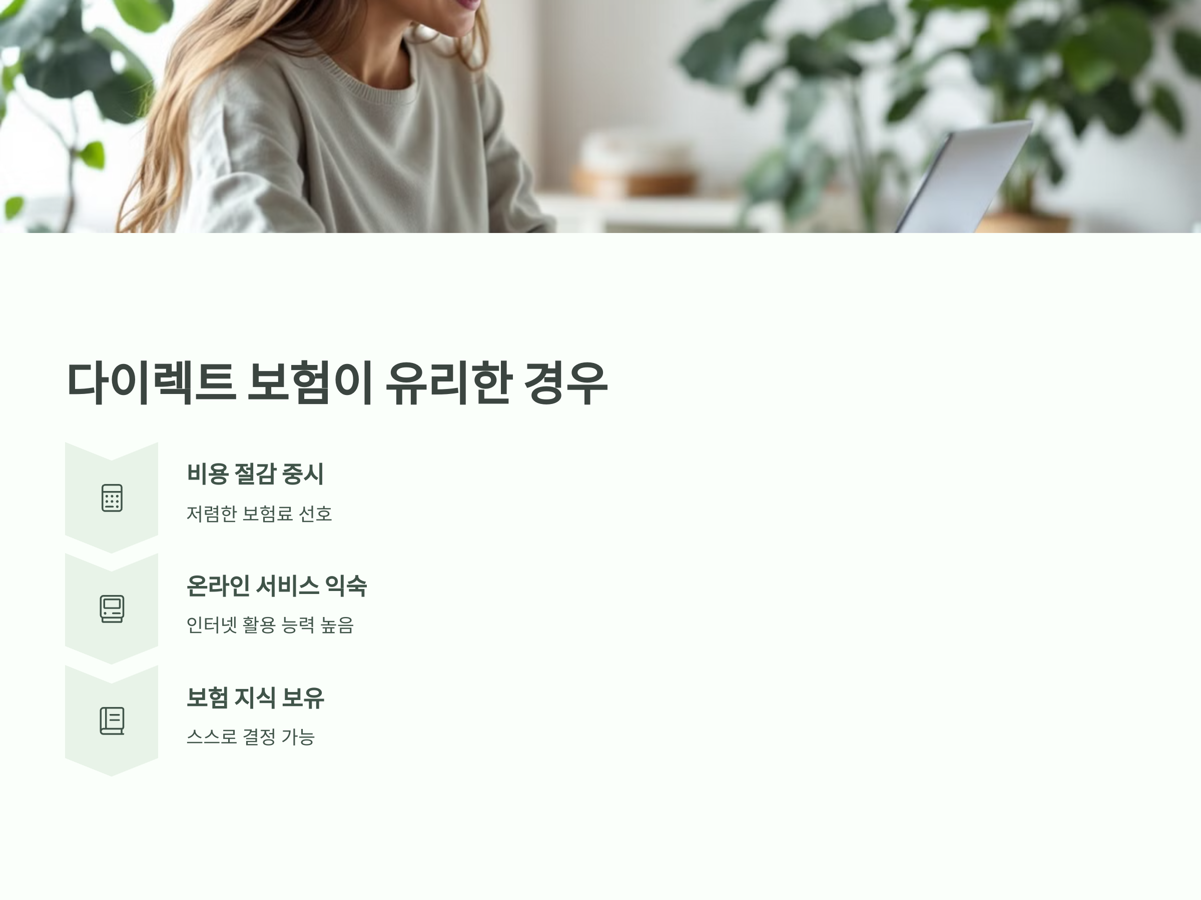 - 온라인 서비스에 익숙한 사람: 다이렉트 보험은 주로 인터넷을 통해 가입하므로, 온라인에서 보험 상품을 비교하고 가입하는 데 익숙한 사람이 유리합니다.