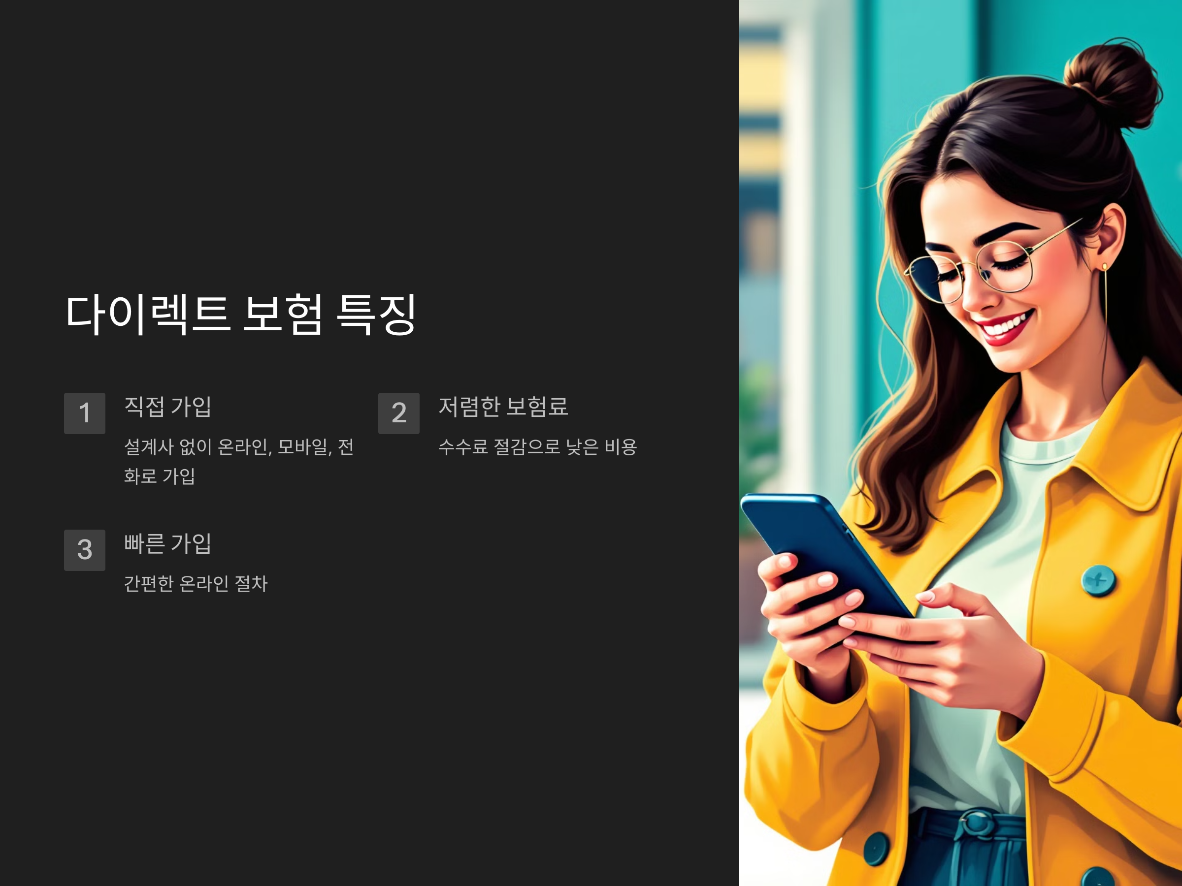 - 저렴한 보험료: 대면 판매보다 운영비가 적게 들기 때문에 보험료가 상대적으로 낮습니다.