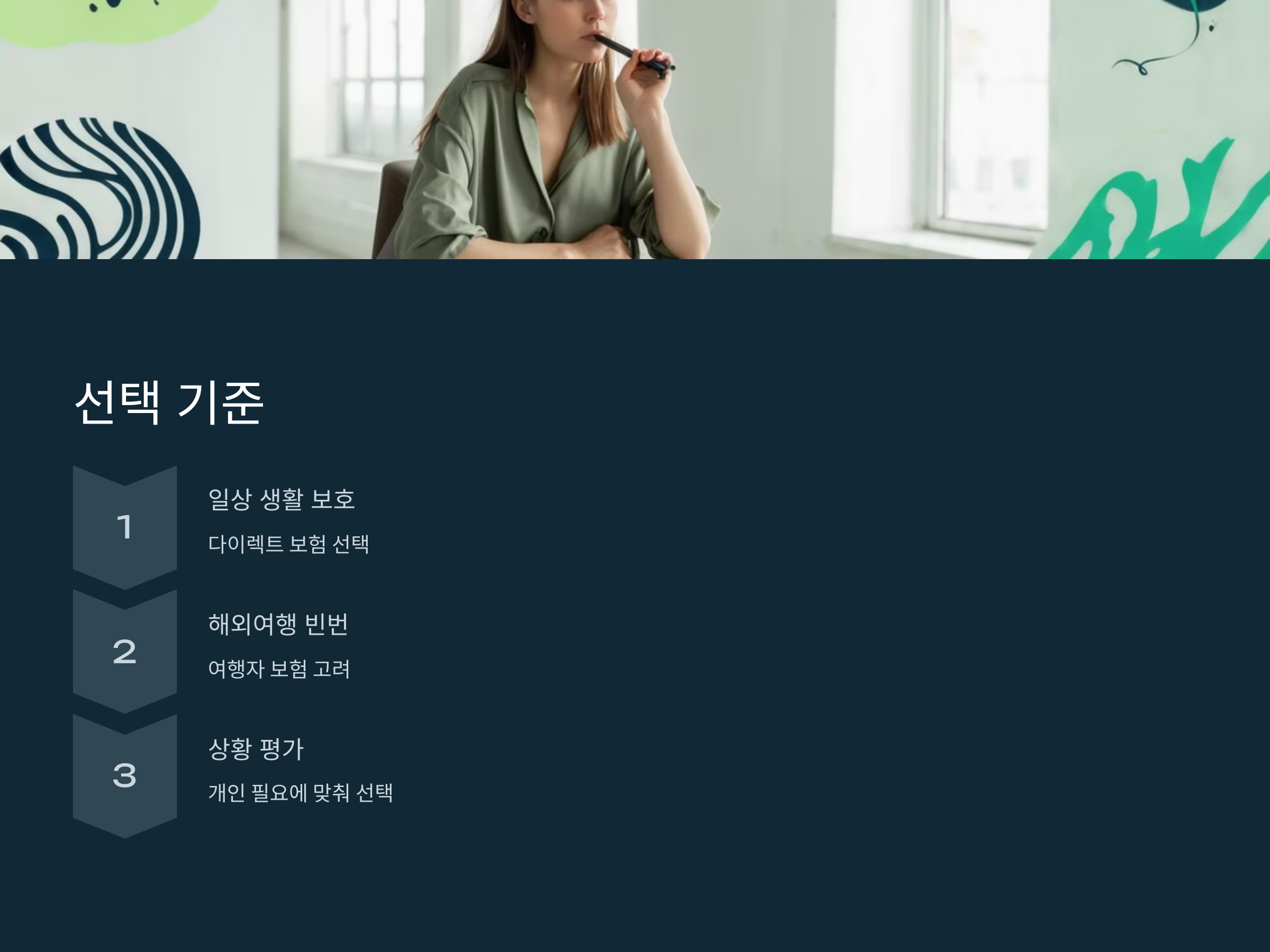 어떤 보험을 선택할지 결정하기 전에 자신이 처한 상황을 고려해야 합니다. 장기적인 생활 안전을 보장받고자 한다면 다이렉트 보험을 선택하는 것이 좋습니다. 일상적인 사고나 질병에 대한 보장을 원한다면, 다이렉트 보험이 훨씬 적합합니다. 반면, 해외여행을 자주 가거나 여행 중 발생할 수 있는 사고나 질병에 대한 보장을 원한다면 여행자 보험이 적합합니다. 여행자는 특히 해외에서 발생할 수 있는 예상치 못한 비용을 대비해야 하기 때문에 여행자 보험의 필요성이 큽니다.