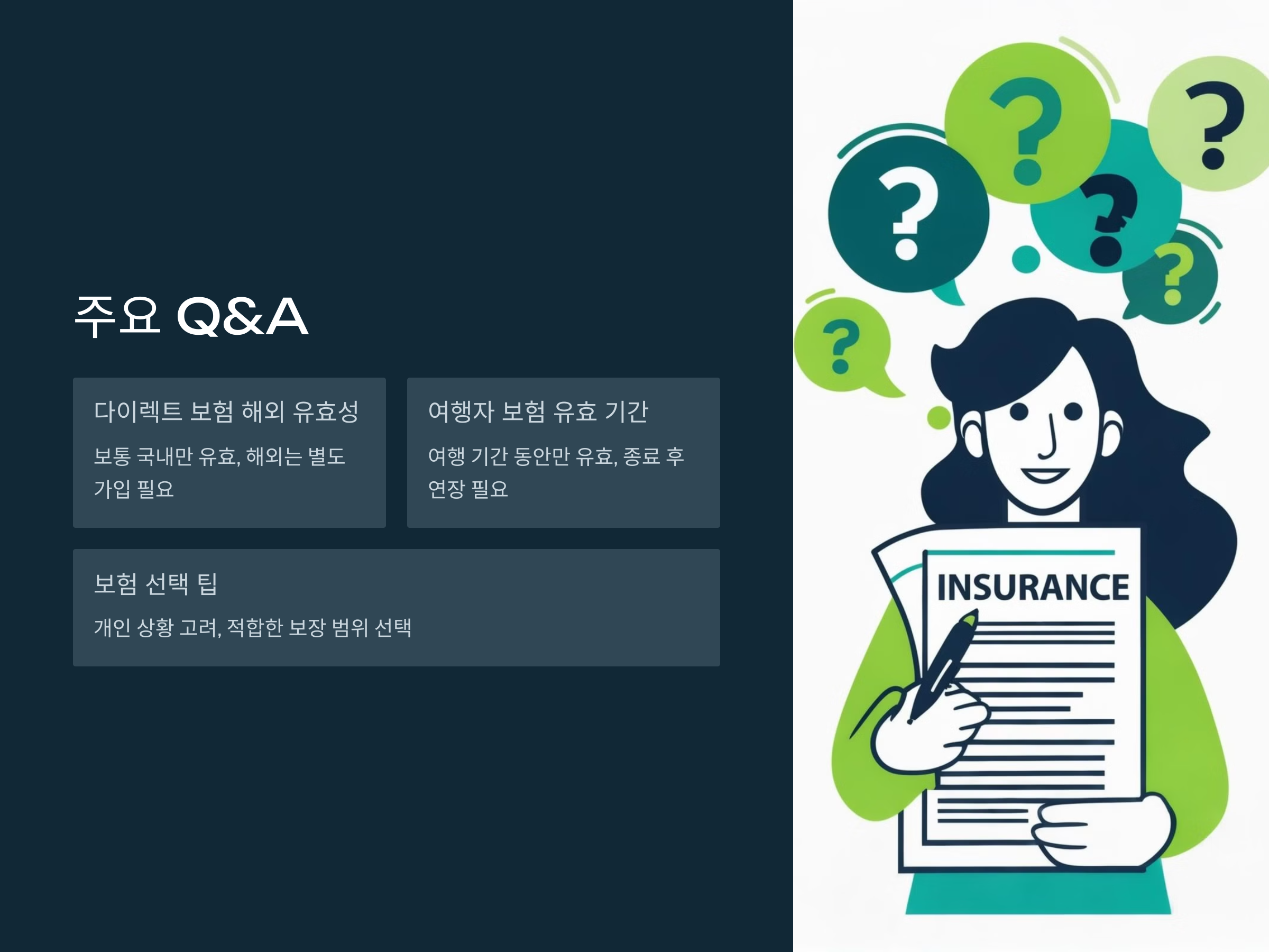 다이렉트 보험은 보통 국내에서만 유효하며, 해외에서 발생한 사고나 질병에 대한 보장을 포함하지 않는 경우가 많습니다. 해외 여행 중 보장이 필요하다면 여행자 보험을 별도로 가입하는 것이 좋습니다.