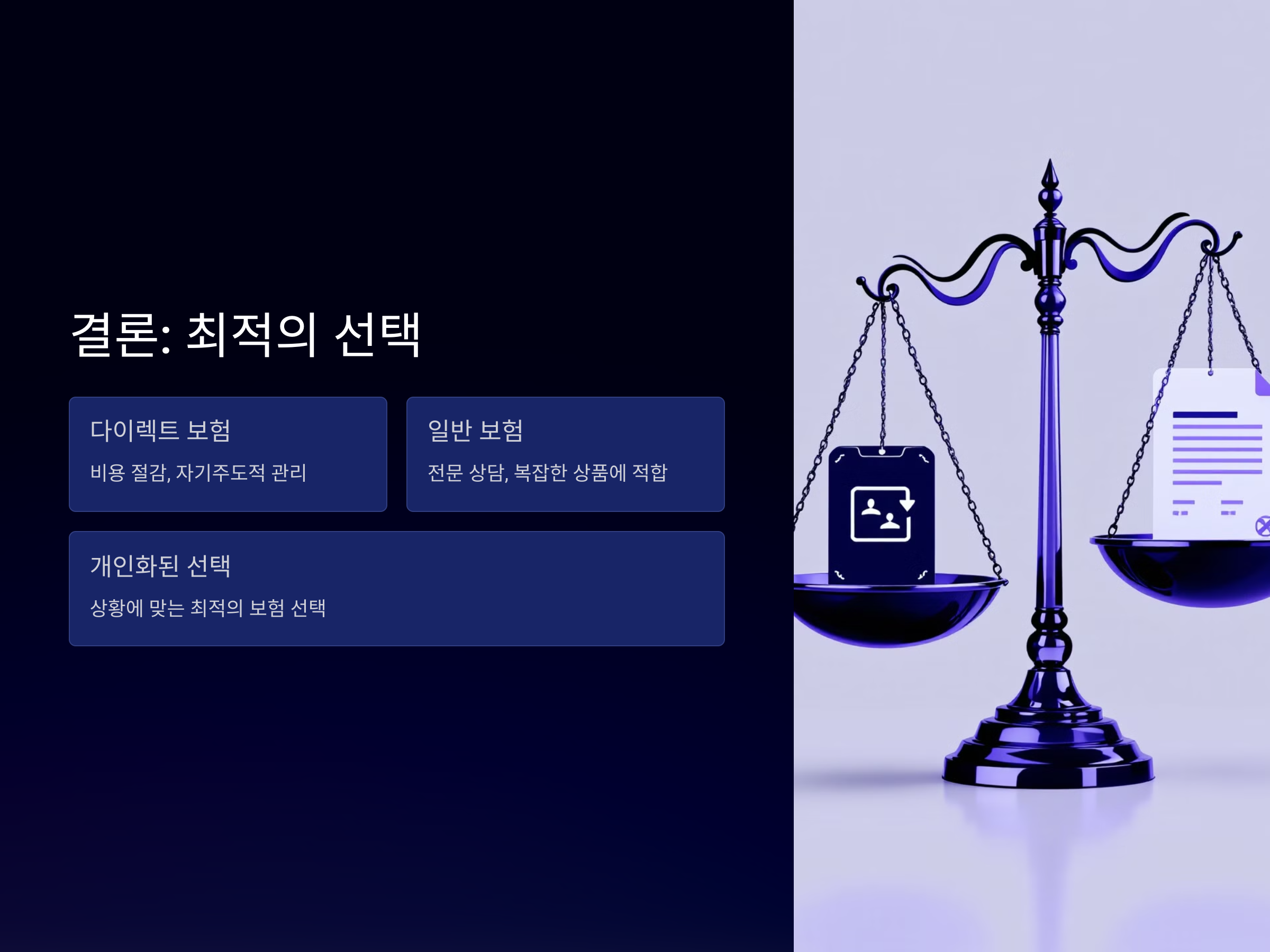 어떤 보험이든 본인의 상황과 필요에 맞춰 선택하는 것이 가장 중요합니다. 만약 보험에 대한 이해도가 높고 비용을 절약하고 싶다면 다이렉트 보험이 적합하며, 전문가의 상담을 원하고 복잡한 보험 상품을 고려한다면 일반 보험이 더 좋은 선택일 수 있습니다.