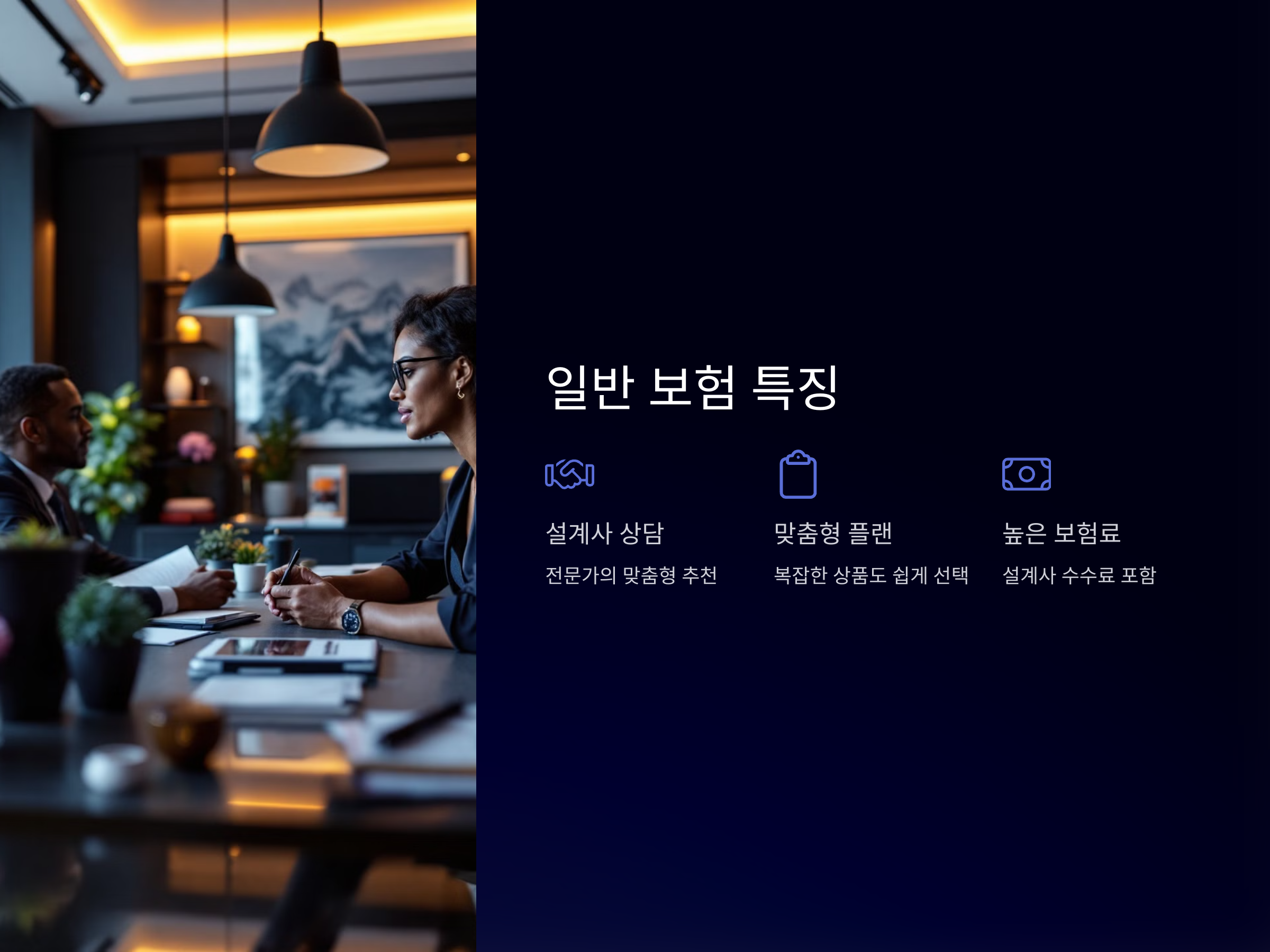 - 설계사의 상담 가능: 보험 전문가가 고객의 상황에 맞춰 최적의 상품을 추천.