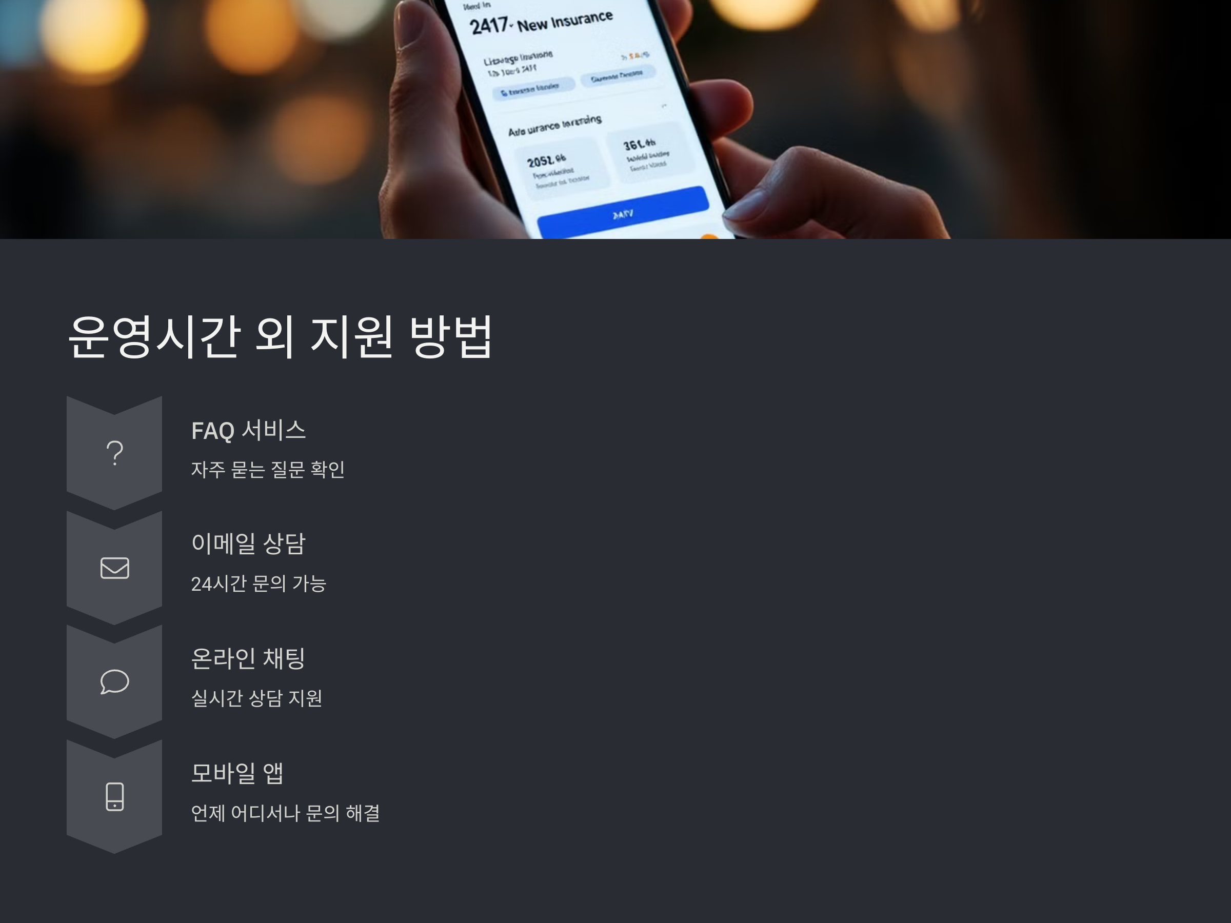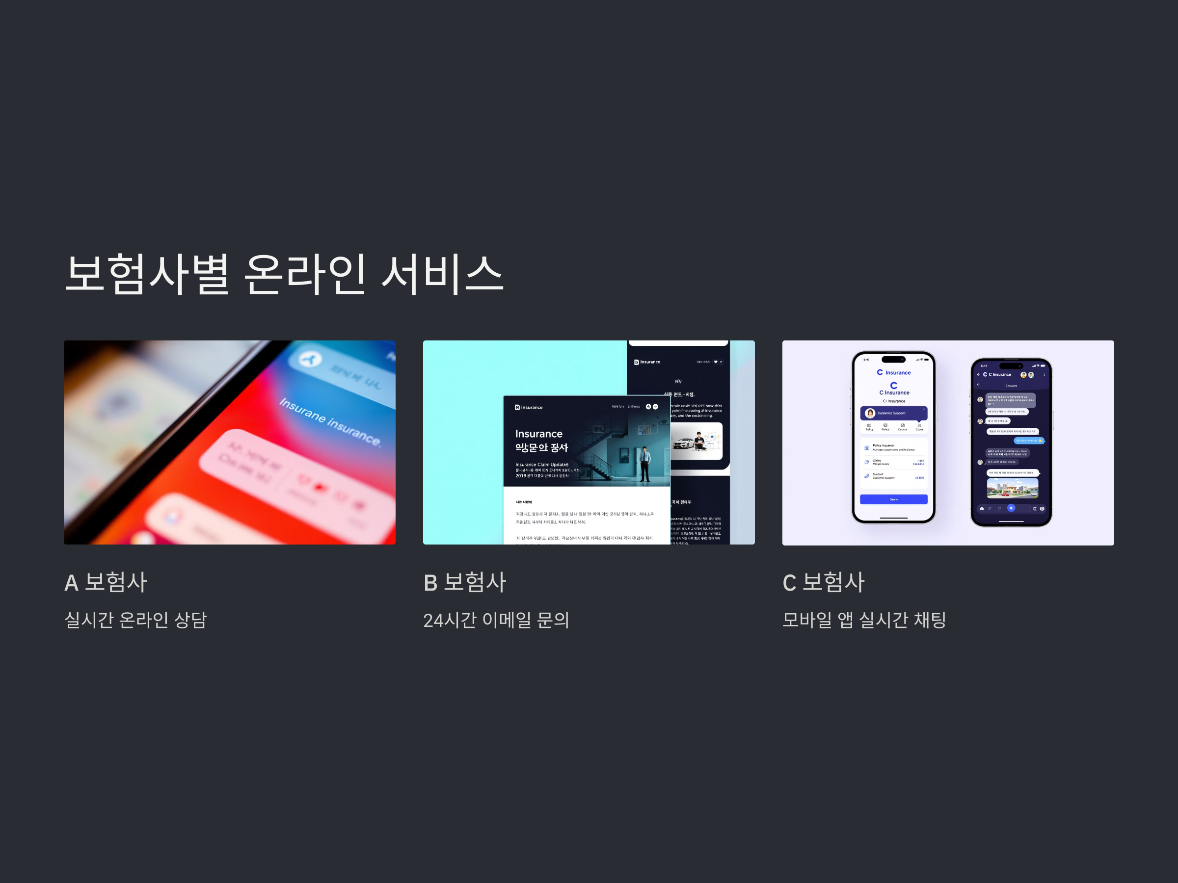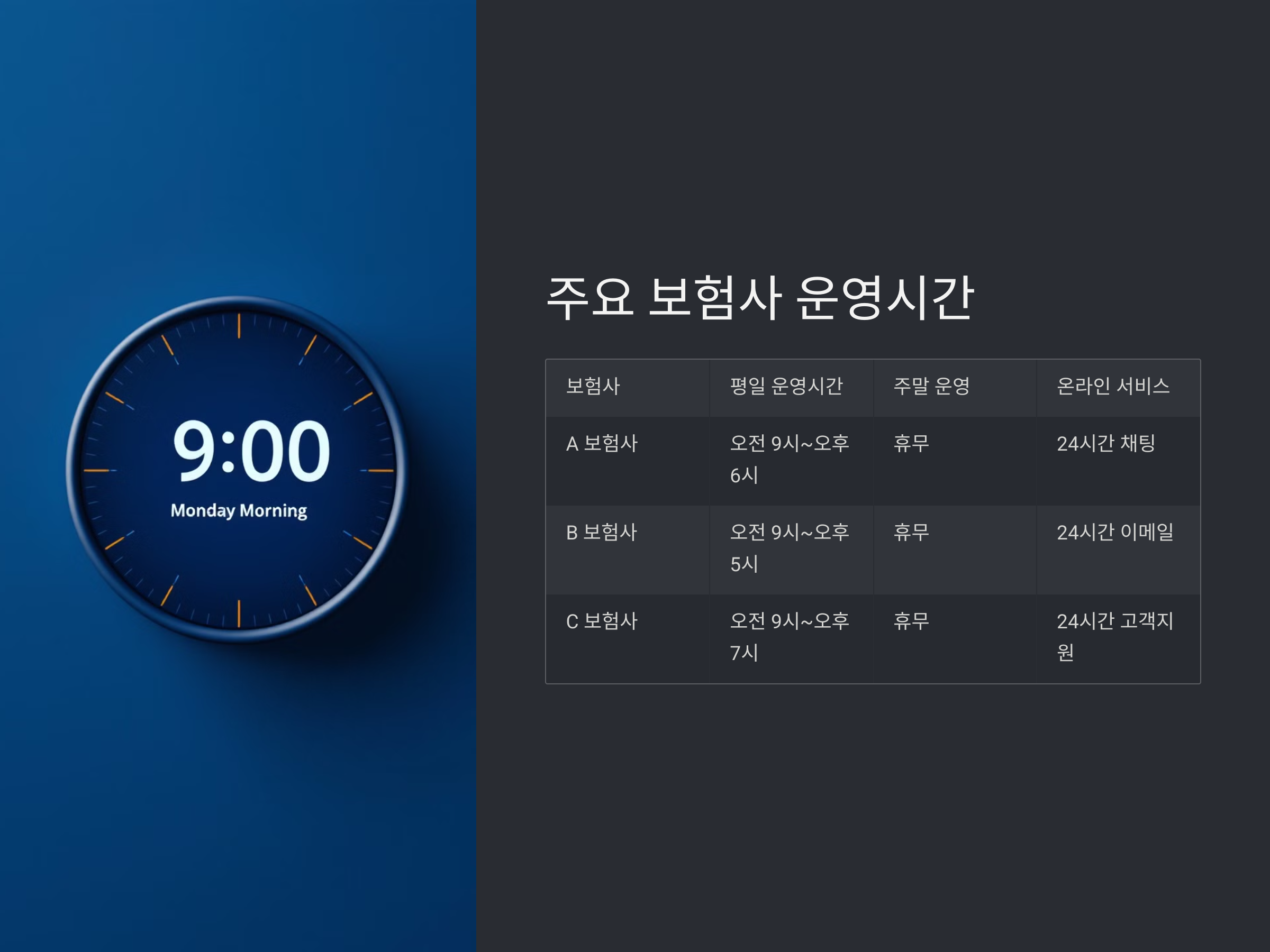- C 보험사: 오전 9시~7시 (주말 휴무), 모바일 앱 실시간 상담