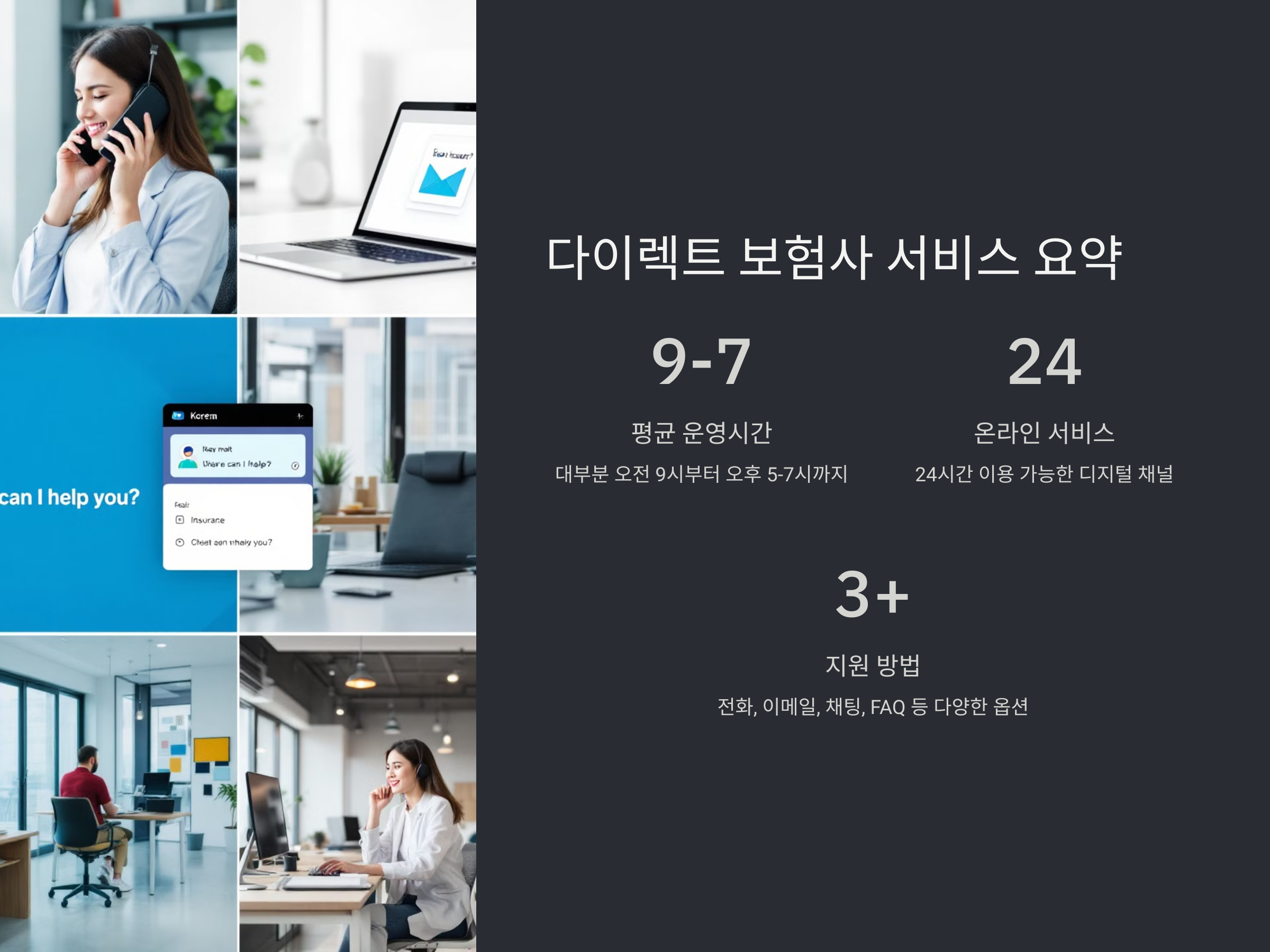 - A 다이렉트 보험사: 평일 오전 9시부터 오후 6시까지 운영되며, 토요일과 일요일은 휴무입니다. 온라인 채팅 서비스는 24시간 제공됩니다.