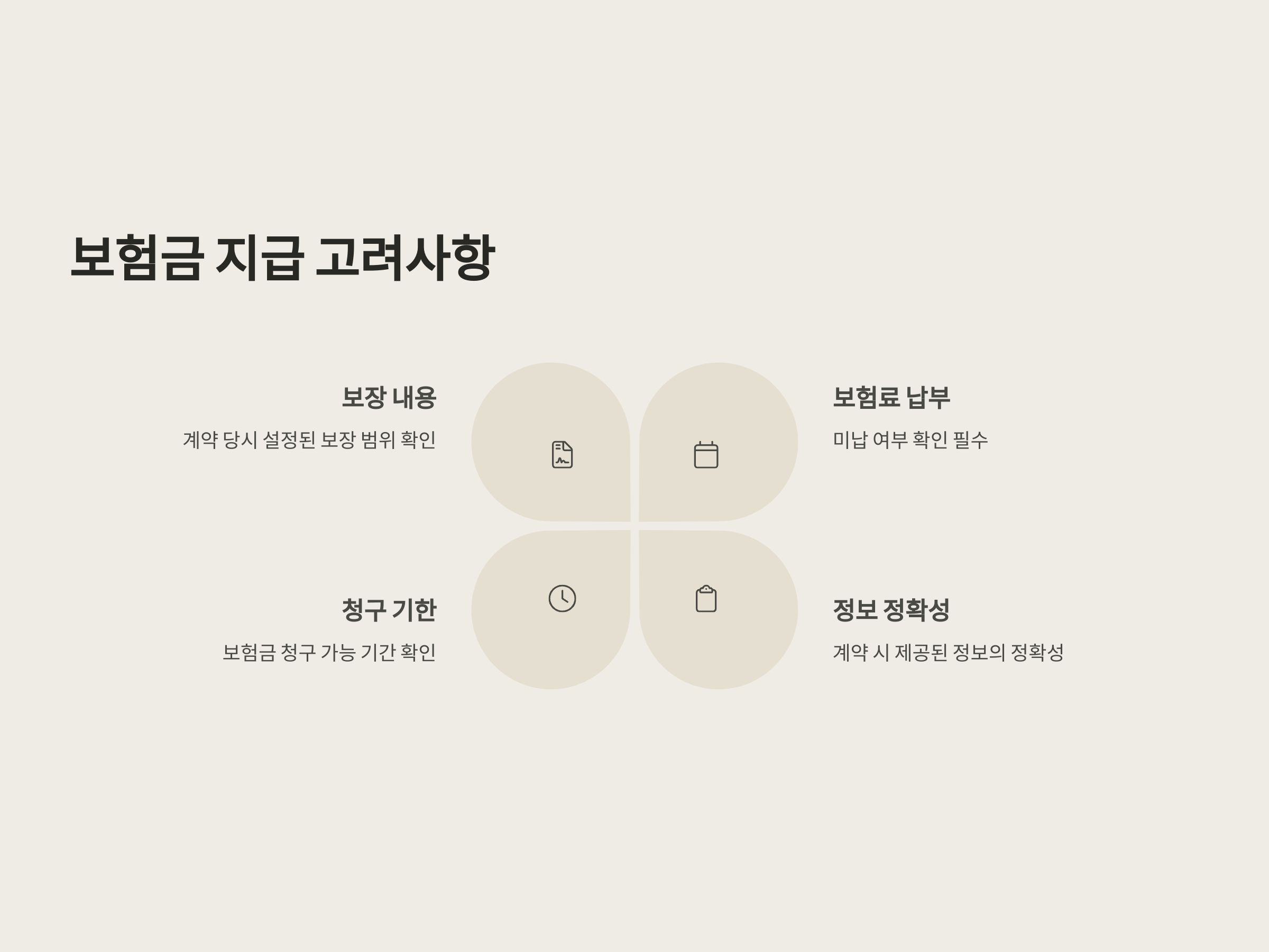 보험금 지급 과정에서 가장 중요한 요소는 계약 당시 설정된 보장 내용입니다. 예를 들어, 사망 보험금의 지급 조건이 특정 사망 원인에 한정되어 있는 경우, 그 조건에 해당하지 않으면 지급이 거절될 수 있습니다. 또한, 다이렉트 보험에서 사망 보험금을 지급받을 수 있는 경우에도, 보험사에서 심사 기준을 두고 면밀하게 확인하는 과정을 거치기 때문에 때로는 시간이 소요될 수 있습니다.