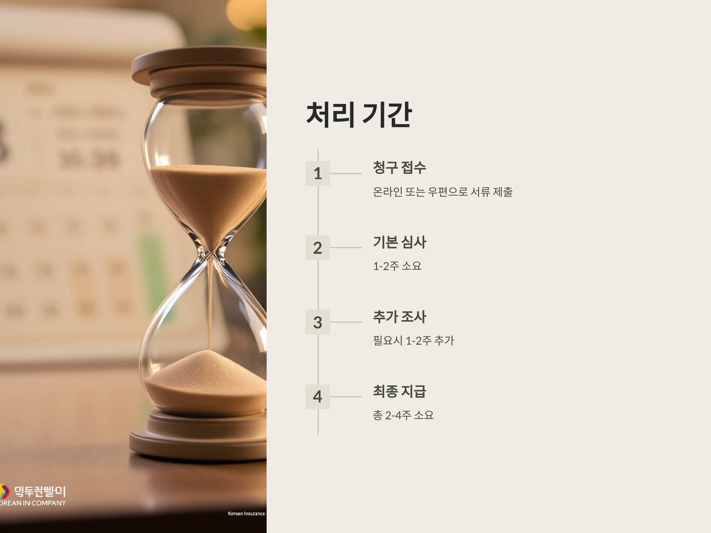 이러한 절차를 고려하여, 보험금을 청구한 후에는 지급 예정 기간을 확인하고 기다리는 것이 좋습니다. 만약 일정 기간 내에 지급되지 않는 경우, 보험사에 문의하여 진행 상황을 확인할 수 있습니다.