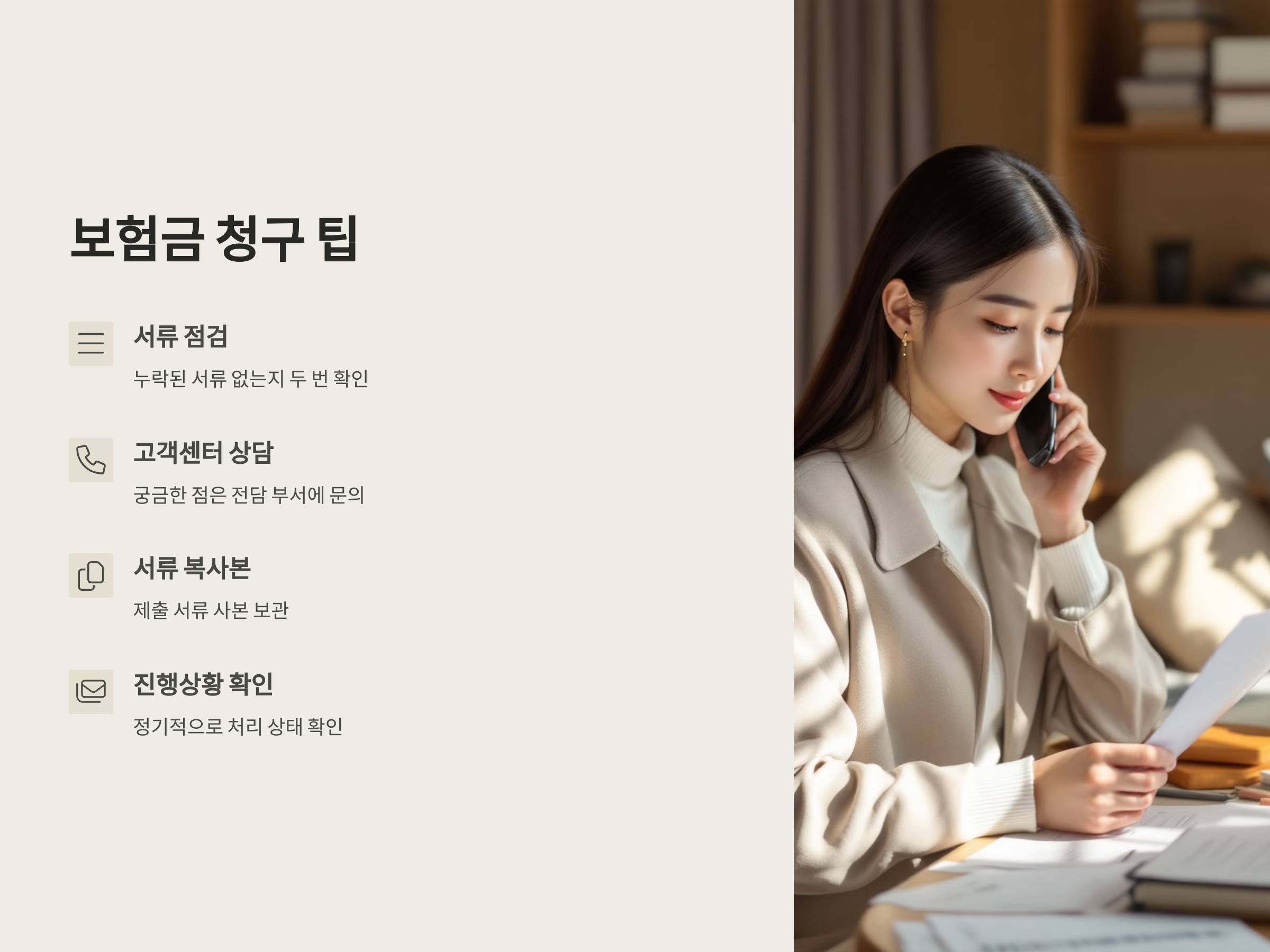 보험금 청구 시 중요한 팁은 서류를 빠짐없이 준비하는 것입니다. 많은 사람들이 서류 제출 시 누락된 부분이 생겨서 보험금 지급이 지연되거나 거절되는 경우가 발생합니다. 따라서 청구 전에 보험사에서 요구하는 서류를 정확히 확인하고, 누락된 서류가 없는지 두 번 확인하는 것이 좋습니다.