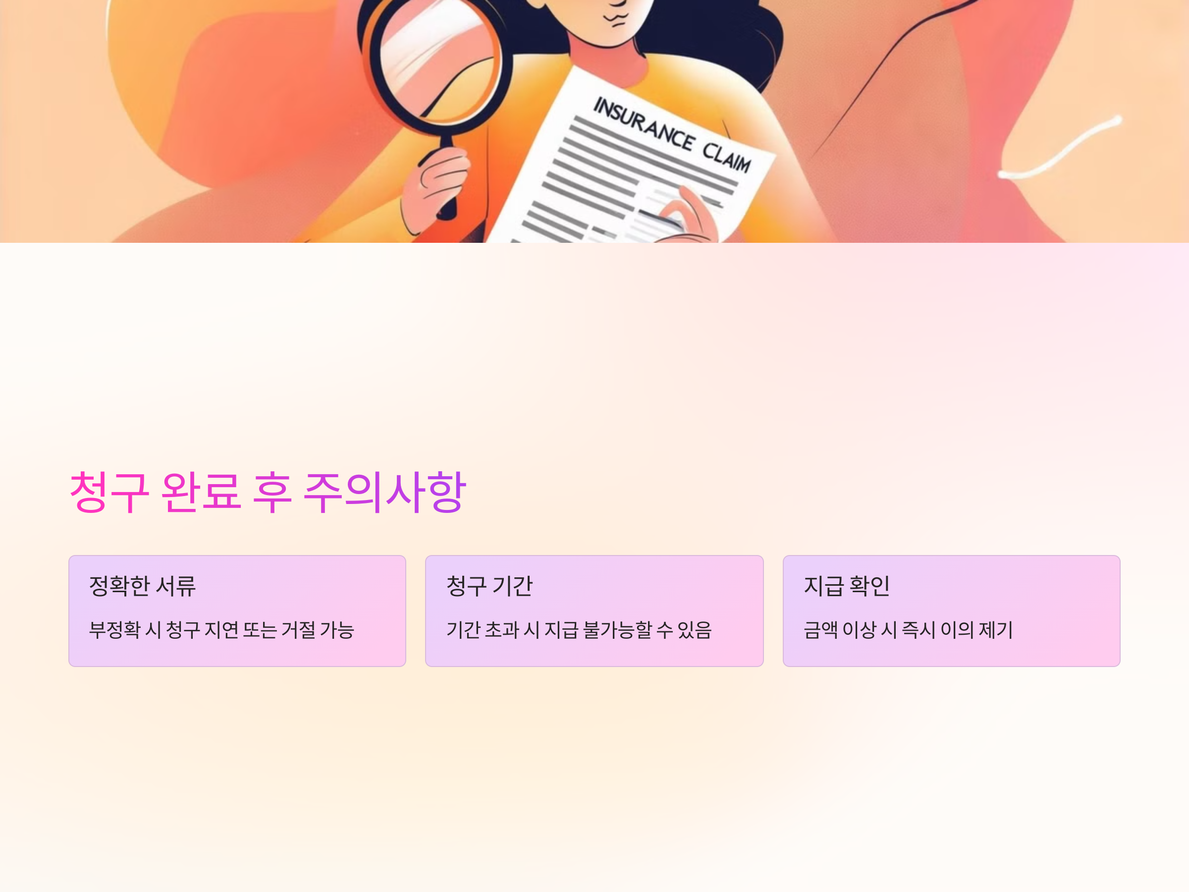 - 정확한 서류 제출: 서류가 정확하지 않으면 청구가 지연되거나 거절될 수 있습니다.