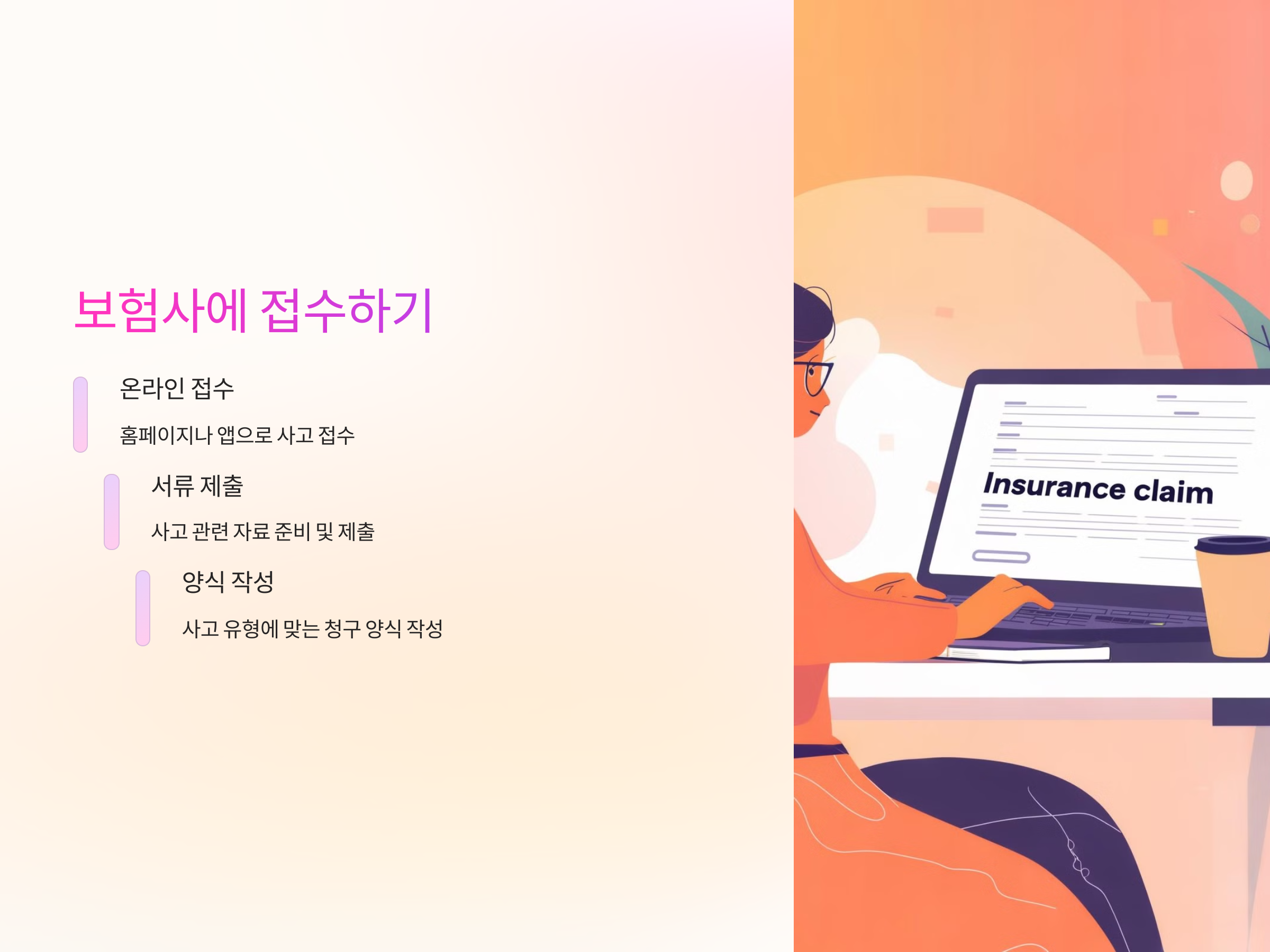 - 사고 유형에 맞는 청구 양식 작성: 차량 사고, 질병, 상해 등 사고의 종류에 따라 다르게 양식을 작성합니다.