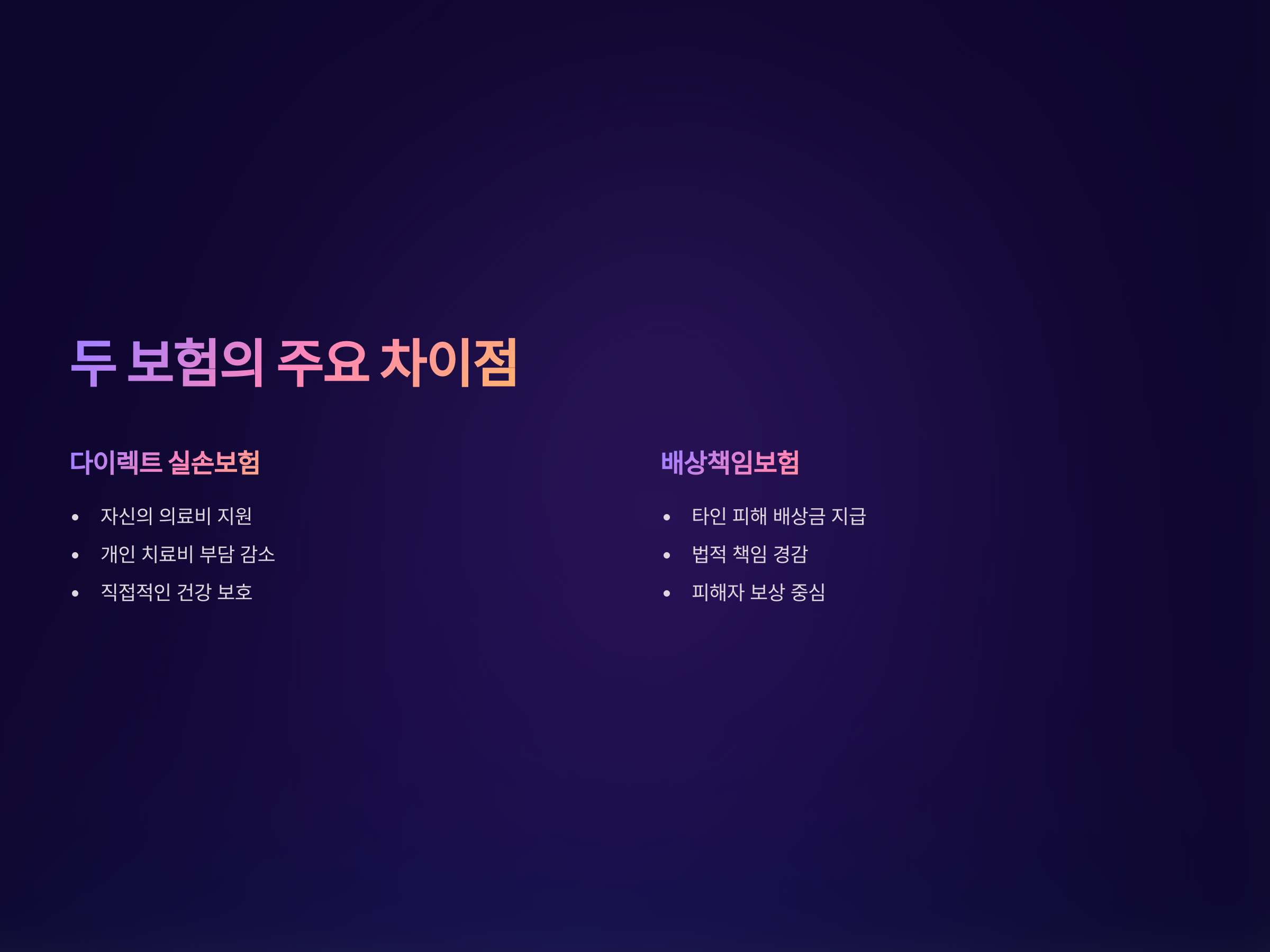 두 보험은 각각 다른 목적을 가지고 있습니다. 다이렉트 실손보험은 개인이 직접 의료비를 지원받을 수 있는 보험으로, 의료비 지출을 줄여주는 역할을 합니다. 반면 배상책임보험은 타인에게 피해를 줬을 때 발생하는 법적 책임을 덜어주는 보험으로, 피해자에게 배상금을 지급하는데 필요한 자금을 보장합니다.