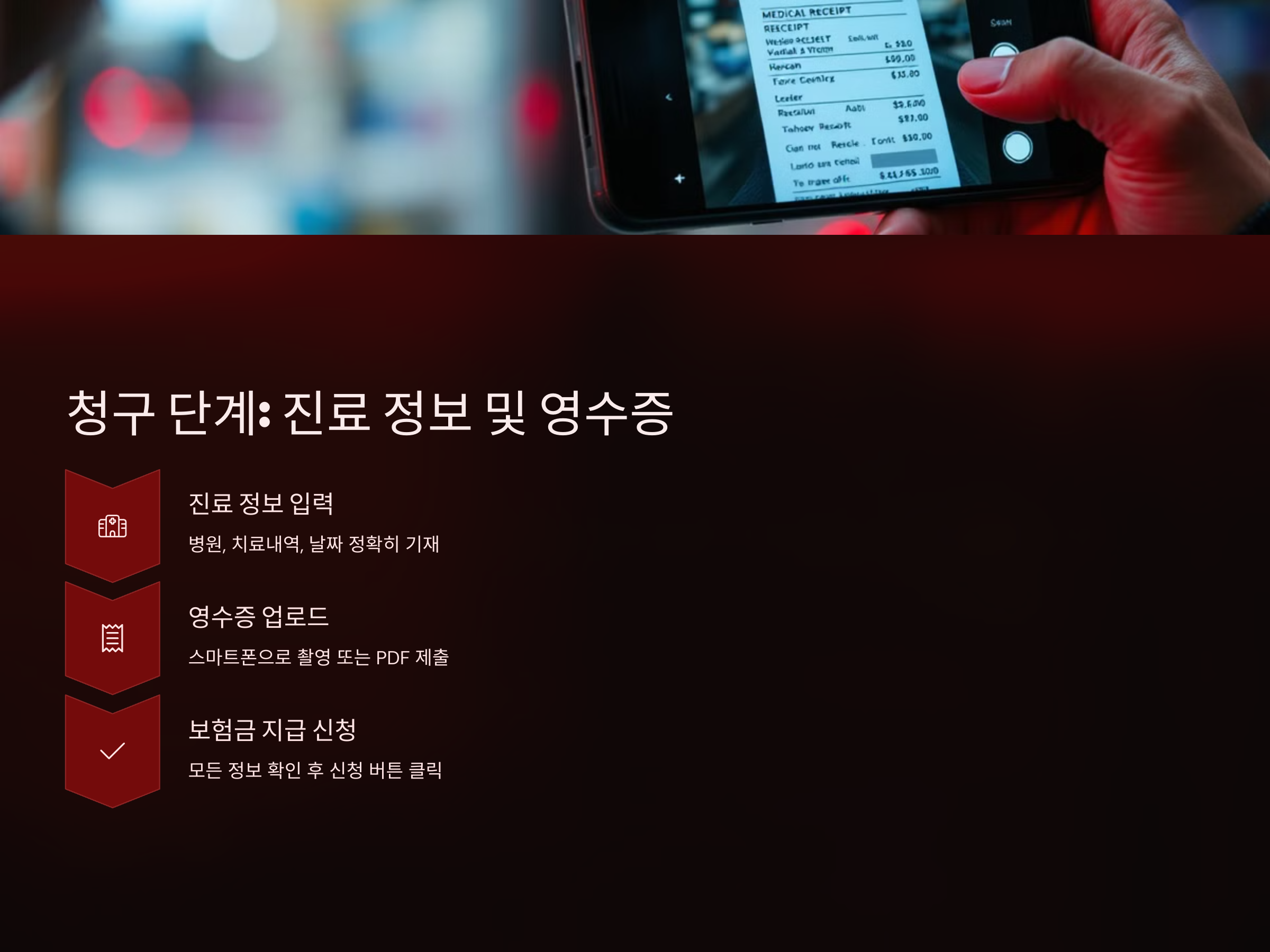 진료를 받은 병원에서 발급한 영수증을 찍어서 업로드해야 합니다. 다이렉트 실손보험 청구 시스템은 대부분 이 영수증을 통해 자동으로 청구 가능한 항목을 추출합니다. 영수증을 스마트폰으로 촬영하거나 PDF 형식으로 제출하면 됩니다.