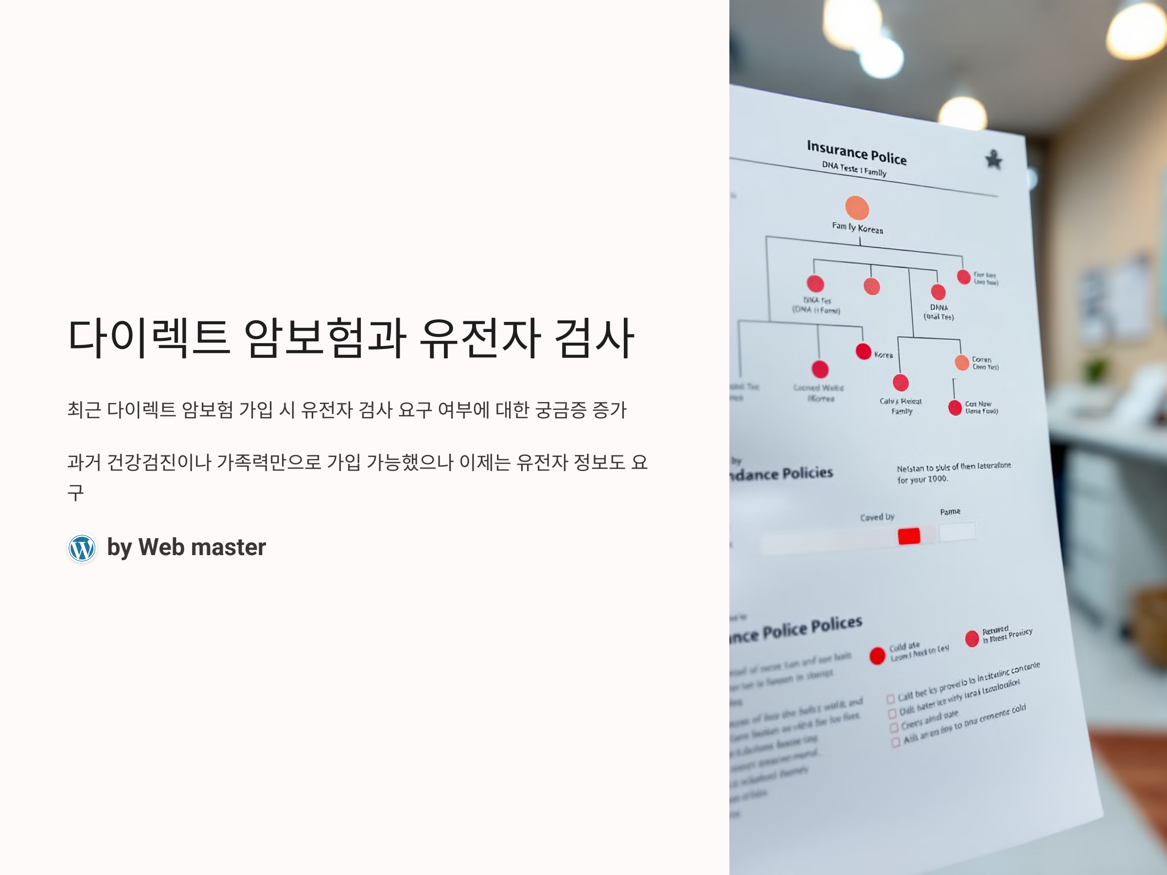 최근 다이렉트 암보험의 인기와 함께, 보험 가입 시 유전자 검사 요구 여부에 대한 궁금증이 커지고 있습니다. 과거에는 건강검진이나 가족력만으로 보험 가입이 가능했지만, 이제는 유전자 정보까지 요구하는 경우가 많아졌습니다. 그럼 다이렉트 암보험에서는 유전자 검사를 요구하는 것일까요? 이 글에서는 유전자 검사 요구 여부와 그 이유에 대해 깊이 있게 분석합니다.