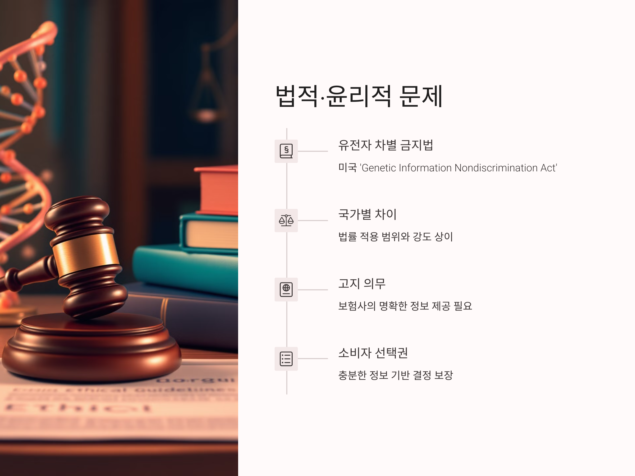 유전자 검사를 보험에 활용하는 것에 대한 법적·윤리적 문제도 중요한 이슈로 제기되고 있습니다. 일부 국가에서는 유전자 정보를 보험 가입에 활용하는 것을 제한하거나 금지하는 법안을 시행하고 있습니다. 예를 들어, 미국에서는 'Genetic Information Nondiscrimination Act'라는 법률을 통해 유전자 정보를 이유로 보험료를 차별하거나 가입을 거부하는 것을 금지하고 있습니다.