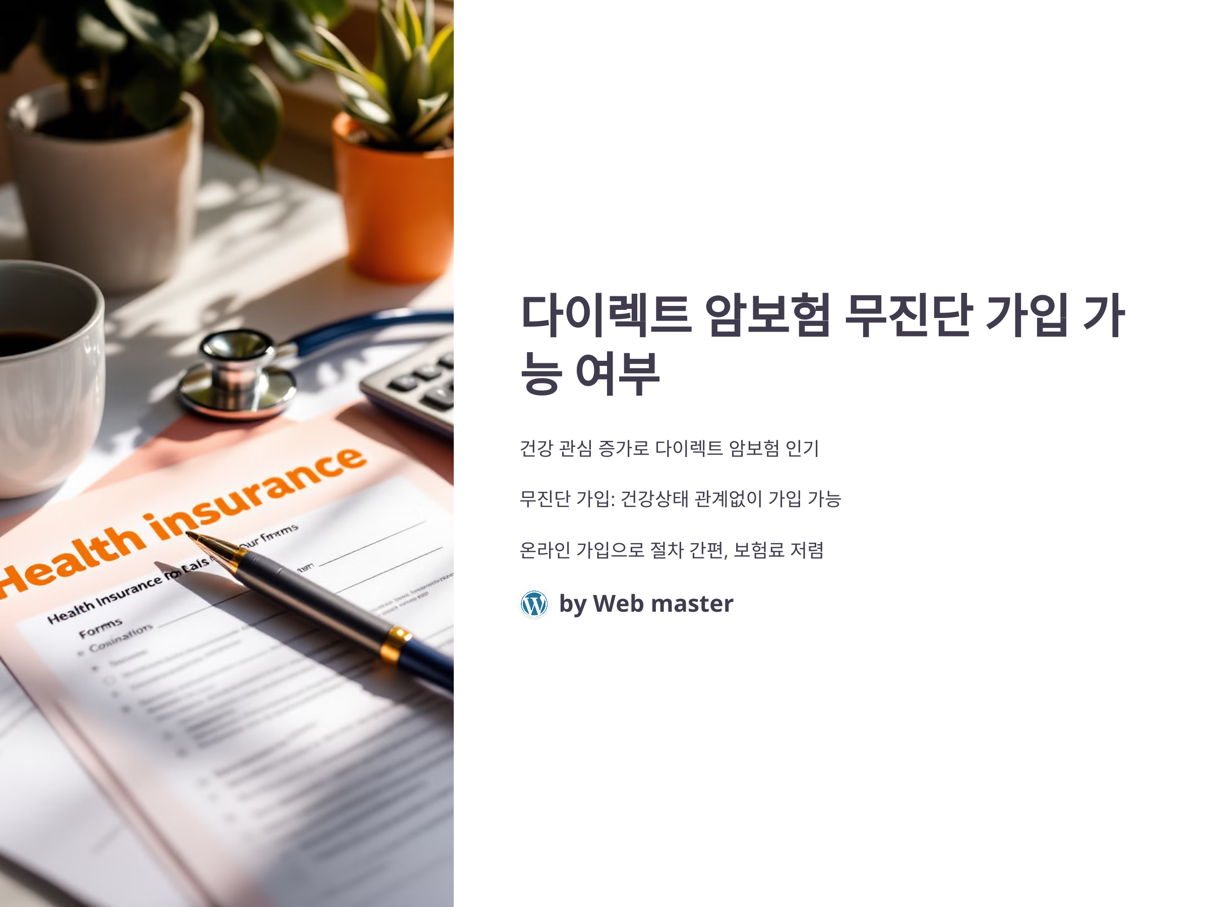 다이렉트 암보험은 온라인을 통해 가입할 수 있는 암보험으로, 가입 절차가 간편하고 중간 유통 과정이 생략되어 보험료가 저렴한 특징이 있습니다. 그러나 ‘무진단 가입’이라는 조건은 보험사마다 다를 수 있으며, 보통은 기존에 암 진단을 받은 이력이 없거나 현재 건강 상태가 양호한 경우에만 가입이 가능하다는 조건이 따르기도 합니다.
