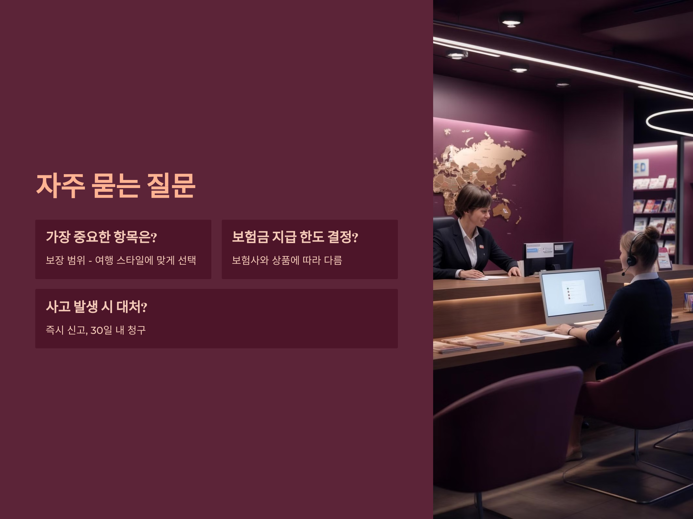 - 24시간 지원 서비스: 해외에서 발생한 사고나 질병에 대해 24시간 상담과 지원을 받을 수 있습니다.