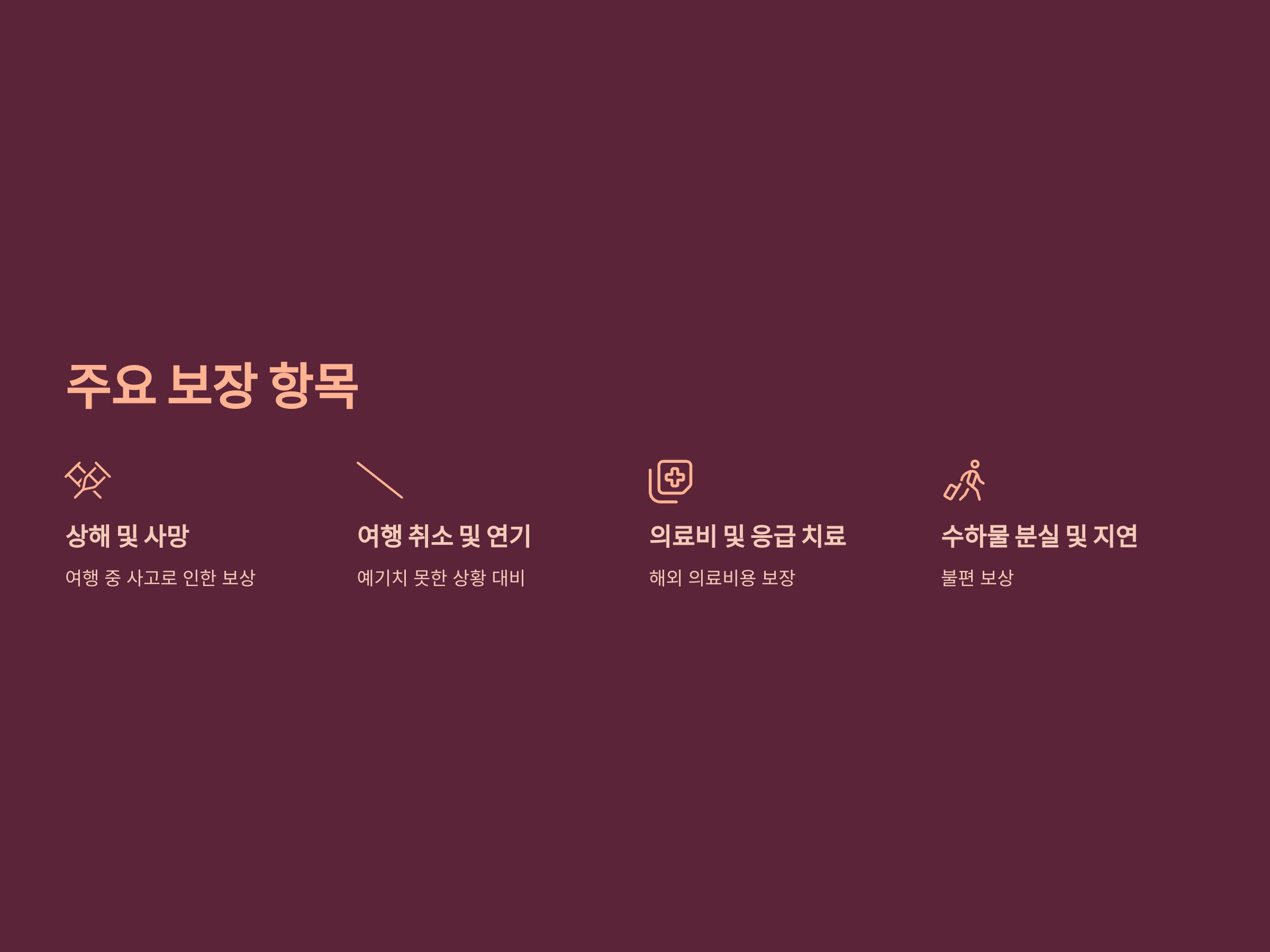 여행 중 사고로 인한 상해나 사망에 대해 보상받을 수 있습니다. 이 항목은 여행자의 건강과 생명에 중요한 영향을 미칠 수 있기 때문에 반드시 확인해야 합니다.