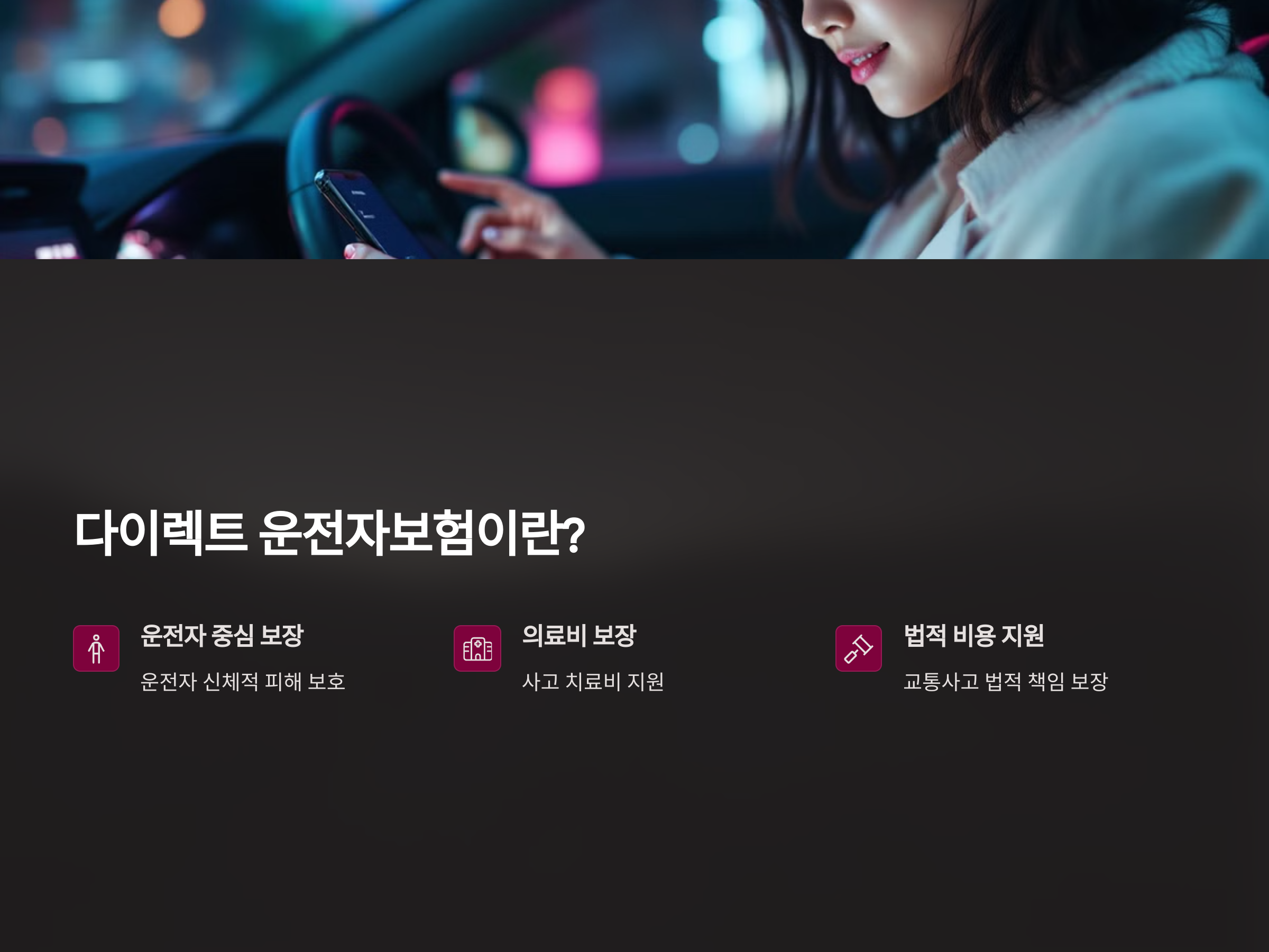 다이렉트 운전자보험은 주로 운전자가 사고를 당했을 때 발생하는 피해를 보장하는 보험입니다. 이 보험은 운전자가 사고로 인해 다칠 경우에 대한 의료비와 함께, 법적 책임을 지게 되는 상황에서도 보장을 받을 수 있습니다. 특히, 사고가 발생했을 때 운전자의 신체적 피해를 보호하는 데 초점을 맞추고 있습니다.