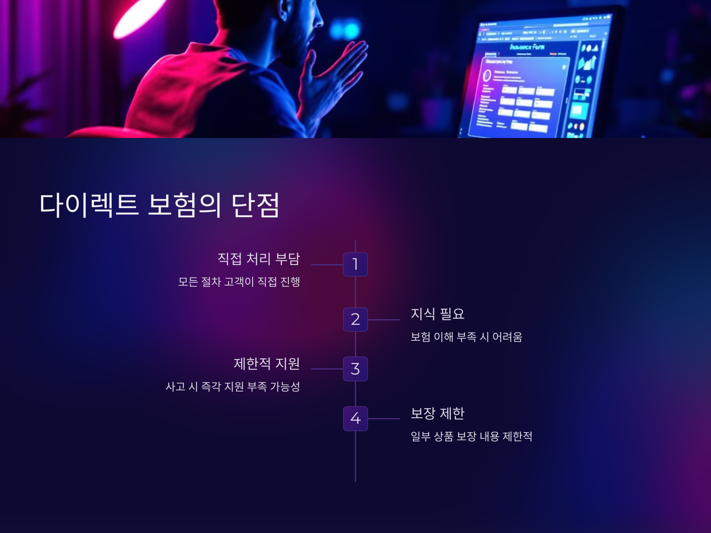 다이렉트 자동차 보험의 단점은 고객이 직접 모든 절차를 처리해야 한다는 점입니다. 보험설계사를 통한 계약과 달리, 다이렉트 보험은 고객이 보장 항목을 스스로 확인하고 선택해야 하므로, 보험에 대한 지식이 부족한 사람에게는 어려운 부분이 될 수 있습니다. 특히, 대인·대물 보장의 세부 항목을 제대로 이해하지 못하면, 사고 발생 시 충분한 보상을 받지 못할 수도 있습니다.