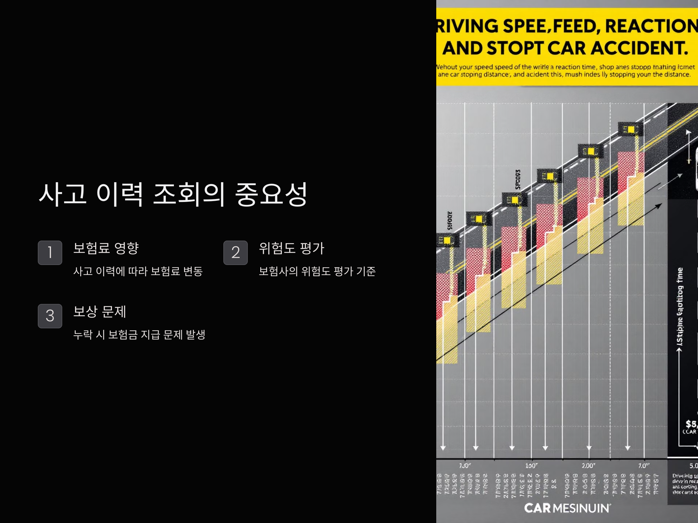 - 사고 이력 정리 및 개선: 과거 사고가 많이 발생한 경우, 향후 사고를 줄이기 위해 안전운전 습관을 기르는 것이 중요합니다. 운전 중 주의력을 높이고, 사고를 방지하기 위한 예방책을 마련하는 것이 필요합니다.