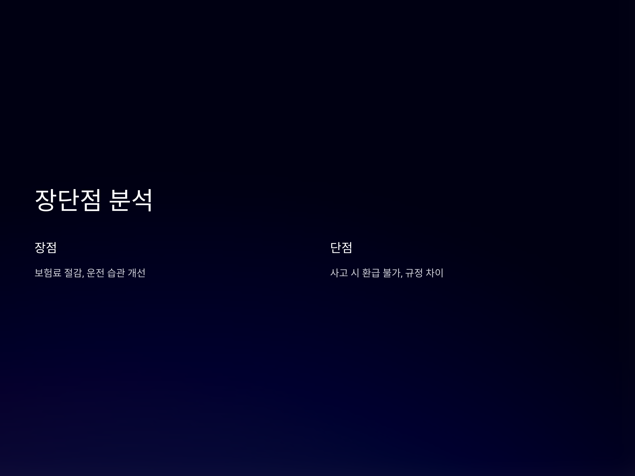 - 운전 습관 개선: 사고를 피하기 위해 더욱 안전 운전에 신경 쓰게 되므로, 운전 습관 개선에 도움이 됩니다.