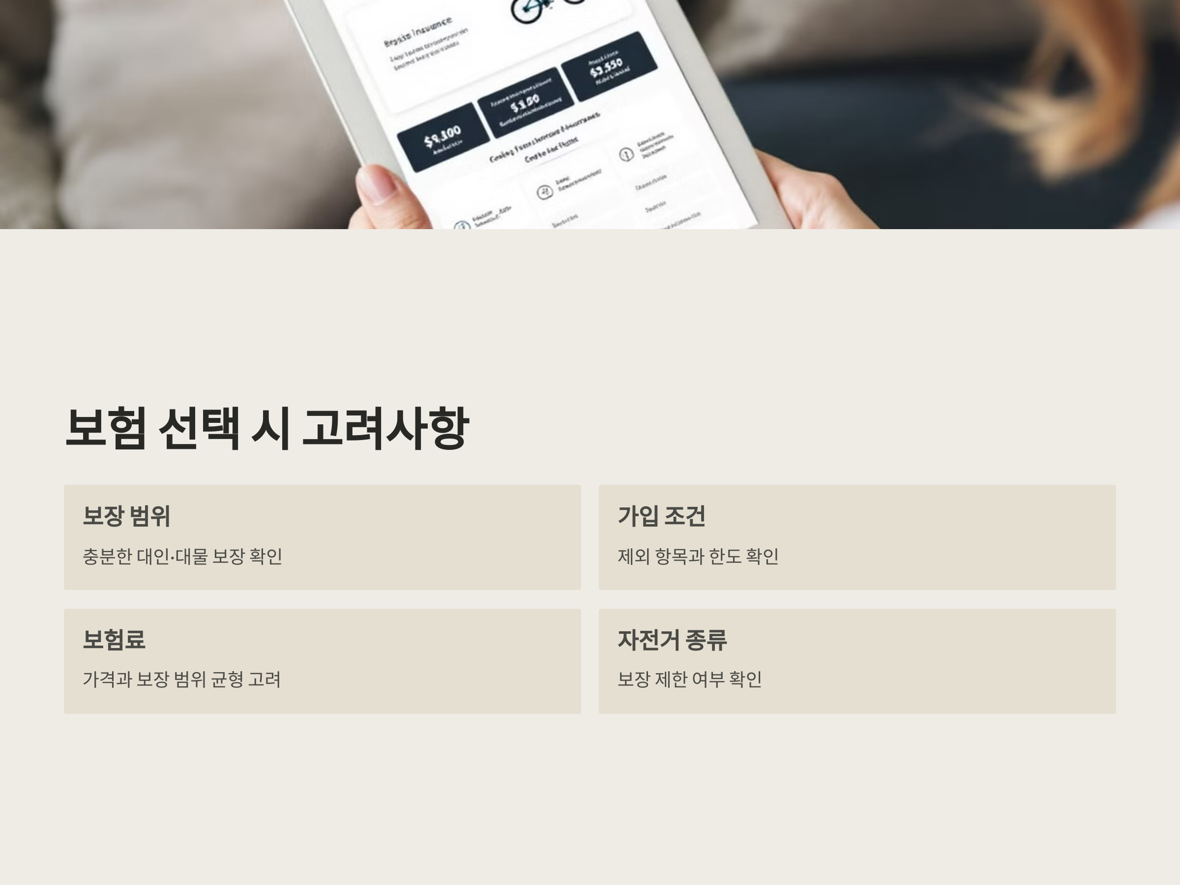 자전거 보험을 선택할 때는 대인 및 대물 보장 외에도 몇 가지 중요한 사항을 고려해야 합니다. 먼저, 보장 범위가 충분한지 확인해야 합니다. 사고 발생 시 치료비와 재산 피해를 모두 보장하는 보험 상품을 선택하는 것이 중요합니다. 또한, 보험의 가입 조건이나 한도, 제외 항목 등을 꼼꼼히 살펴봐야 합니다. 일부 보험은 특정 조건에서만 보장이 가능하거나, 자전거의 종류에 따라 보장이 제한될 수 있기 때문에, 자신의 상황에 맞는 상품을 선택하는 것이 중요합니다.