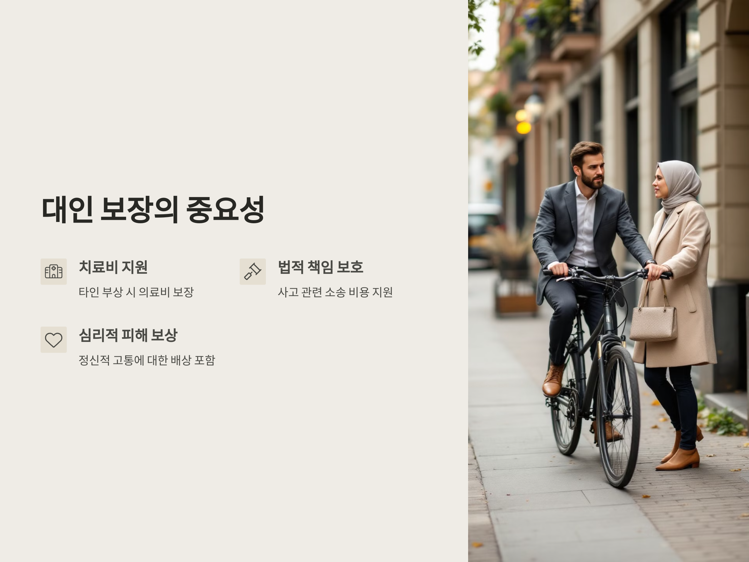 대인 보장과 대물 보장의 가장 큰 차이점은 그 보장 대상에 있습니다. 대인 보장은 타인의 신체적 피해를 보상하는 데 집중하는 반면, 대물 보장은 타인의 재산에 발생한 손해를 보상합니다. 자전거 사고가 발생했을 때, 두 항목 모두 중요하지만, 사고 후 법적 책임과 경제적 부담을 줄이기 위해서는 두 항목 모두 적절하게 보장하는 보험을 선택하는 것이 중요합니다.