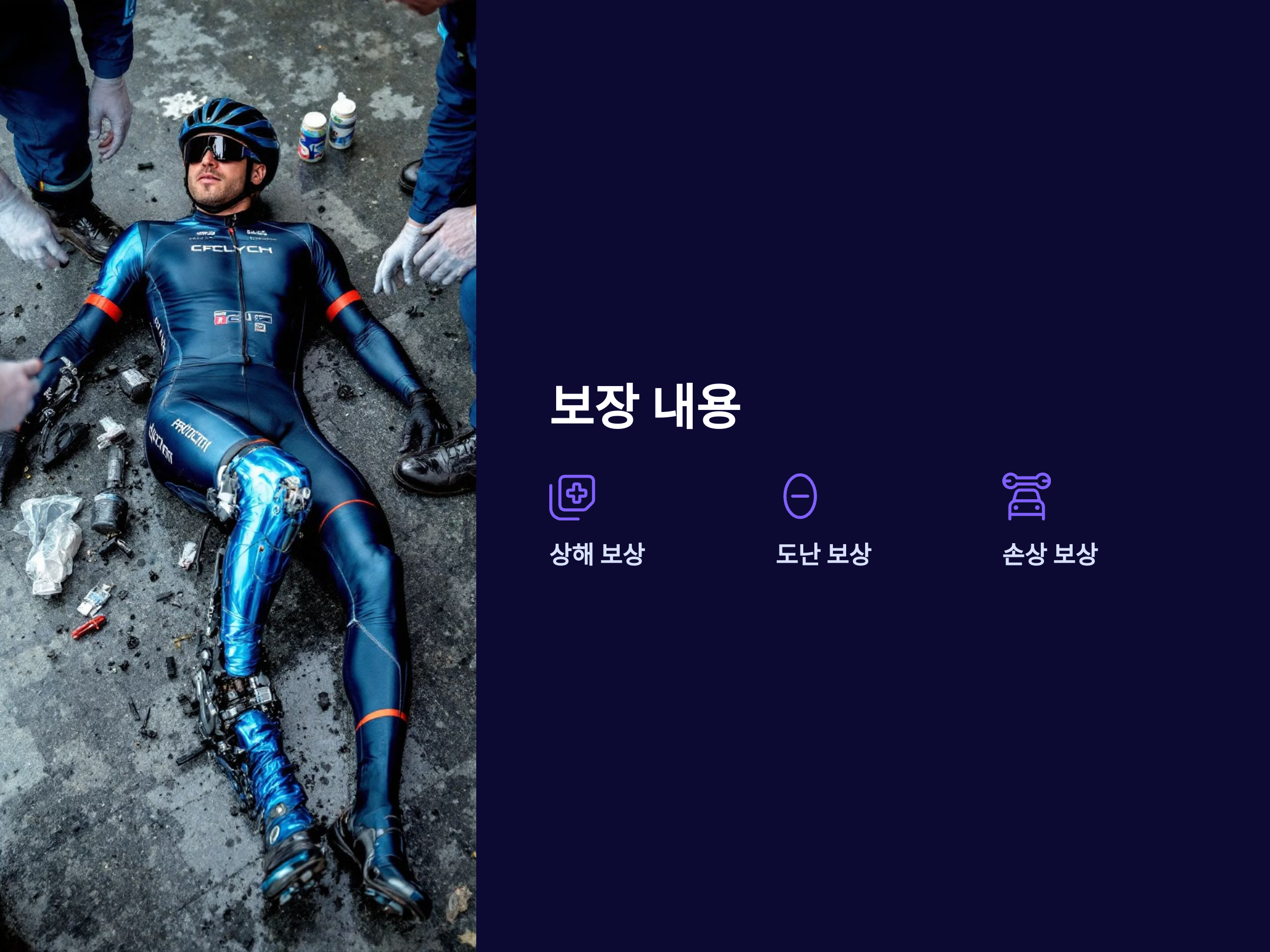 사고로 인한 자전거의 손상도 보장 범위에 포함될 수 있습니다. 자전거가 손상된 경우, 수리비를 지원해줍니다.