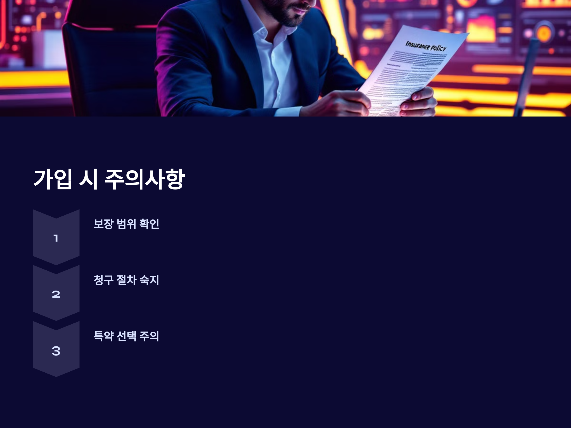 보험 가입 시에는 주의해야 할 몇 가지 사항이 있습니다. 사고 발생 시 보장 범위나 혜택이 달라질 수 있기 때문에, 보험의 약관을 꼼꼼하게 확인하는 것이 중요합니다.