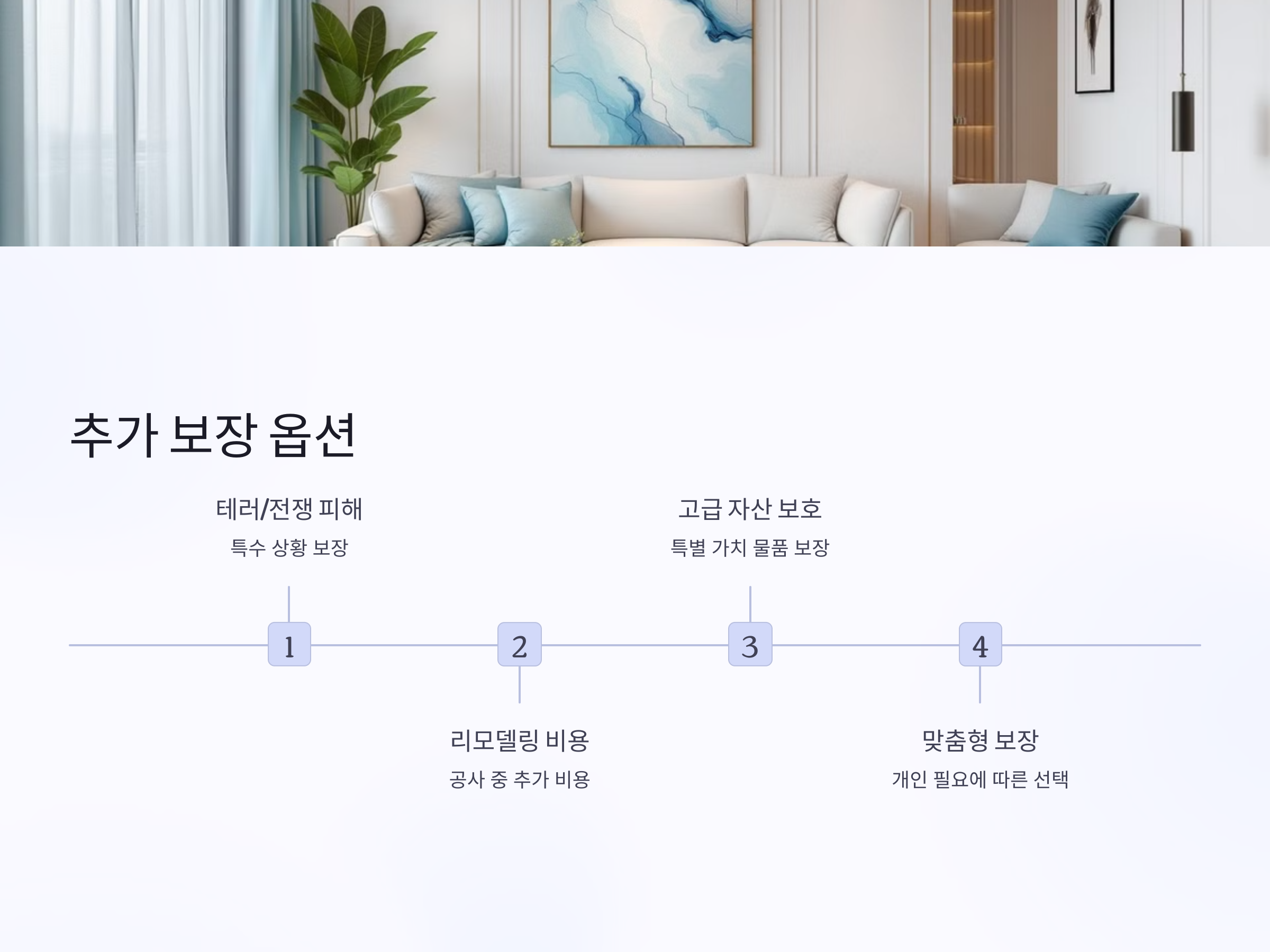 다이렉트 주택 보험은 기본적인 보장 외에도 다양한 추가 보장 옵션을 제공합니다. 예를 들어, 테러나 전쟁으로 인한 피해를 보장하는 항목이나, 주택 리모델링 시 발생할 수 있는 추가 비용을 보장하는 항목 등이 있을 수 있습니다. 이러한 추가 보장 옵션은 주택의 특성이나 개인의 필요에 따라 선택할 수 있습니다.
