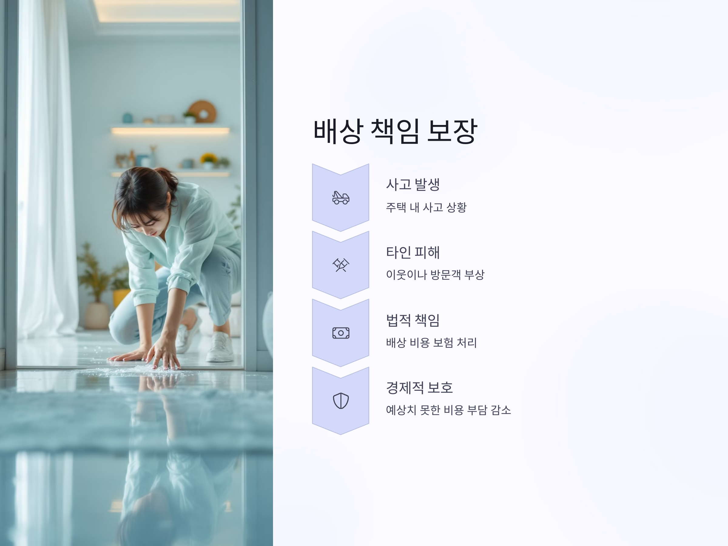 배상 책임 보장은 주택 보험에서 빼놓을 수 없는 중요한 항목입니다. 이 항목은 주택에서 발생한 사고로 다른 사람에게 피해를 주었을 경우, 해당 피해에 대한 법적 책임을 대신 져주는 보장입니다. 예를 들어, 자택에서 발생한 사고로 이웃이 다치거나 재산 피해를 입었을 때, 그에 대한 배상 비용을 보험에서 지급합니다.
