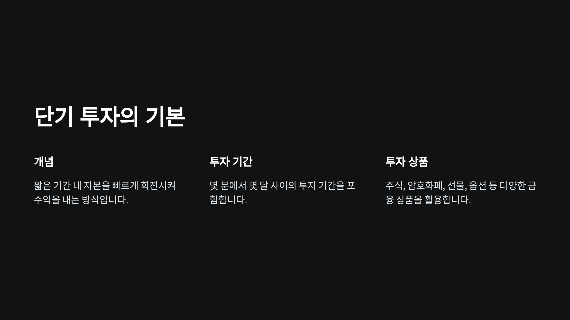 - 단기 투자는 고수익만큼 고위험이 따른다는 점을 기억하세요.