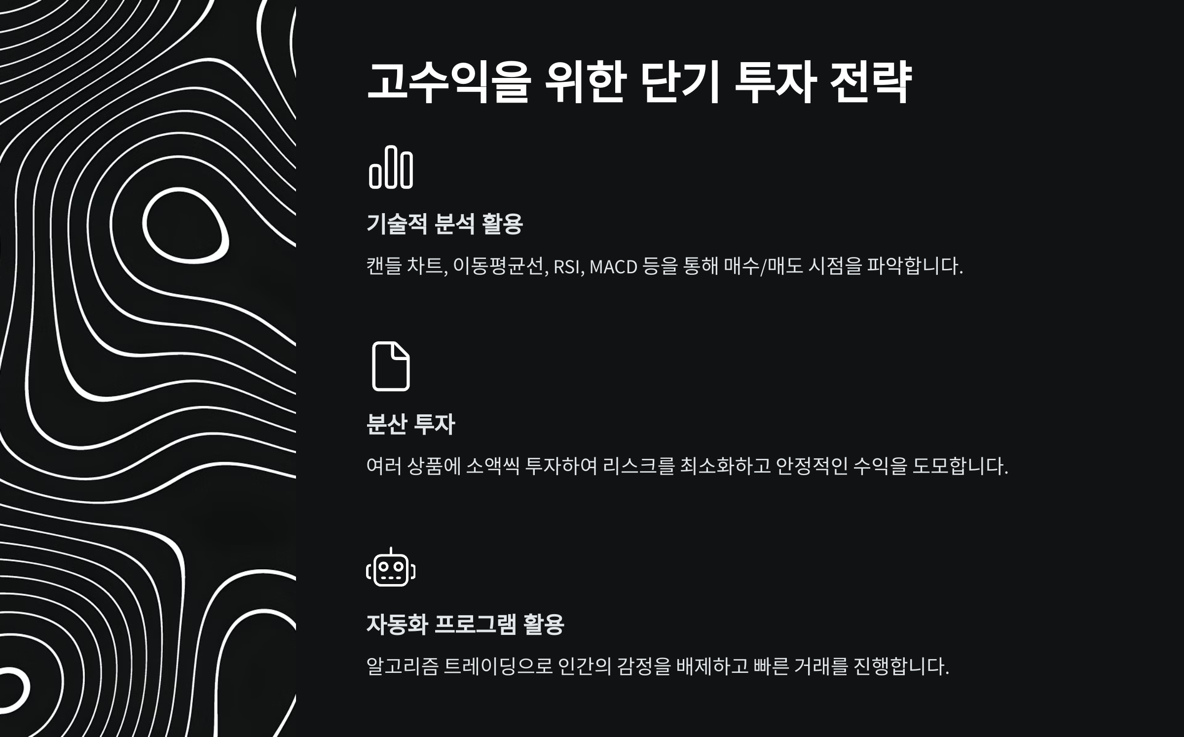 - 지표 활용: 이동평균선(MA), RSI, MACD 등을 통해 매수/매도 시점을 파악.