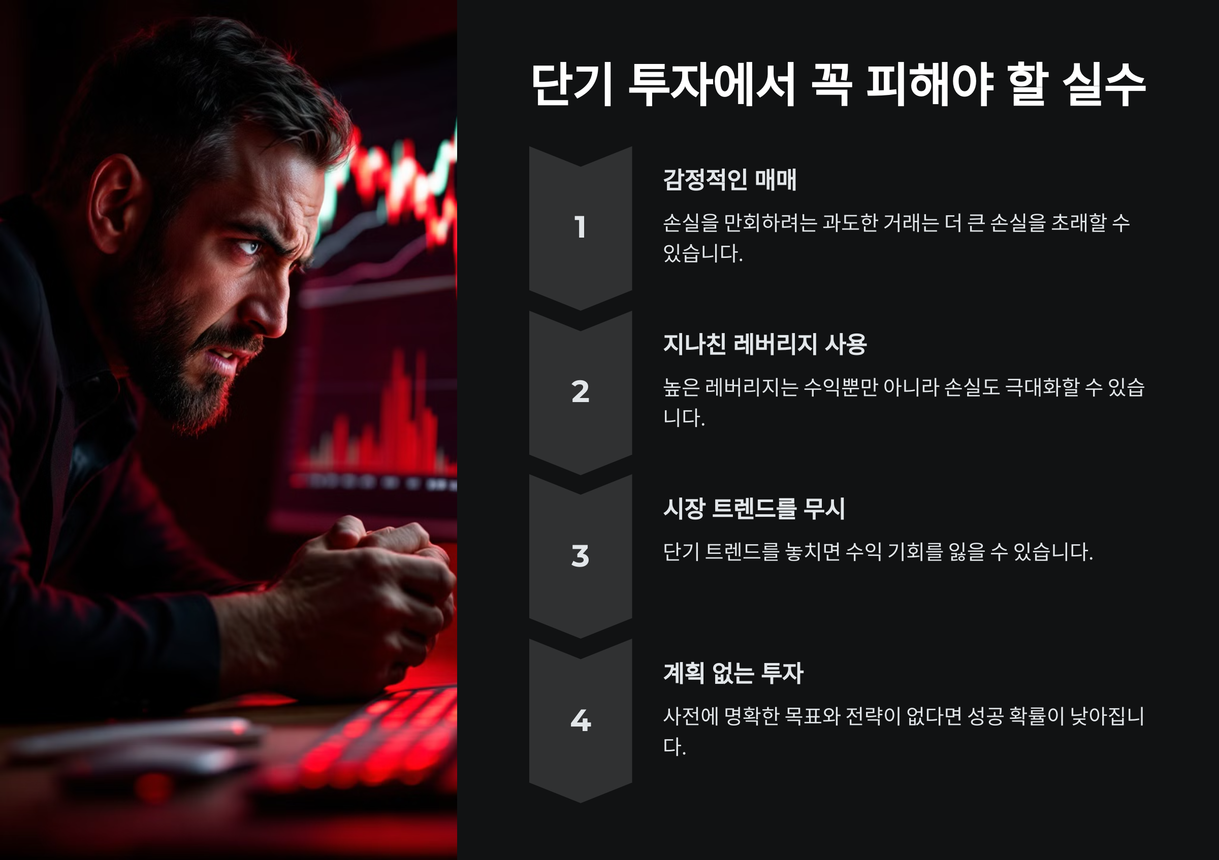 단기 투자에서 흔히 저지르는 실수를 방지해야만 성공 가능성을 높일 수 있습니다.