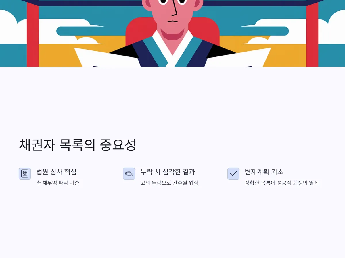 따라서 채권자 목록은 단순한 정보정리가 아니라, 회생 절차의 성패를 가르는 핵심 포인트입니다. 그리고 요즘은 금융권 채무 외에도 세금 체납, 통신사 미납 요금 등도 모두 포함해야 하므로 일반인이 직접 정리하기엔 매우 복잡해졌습니다.