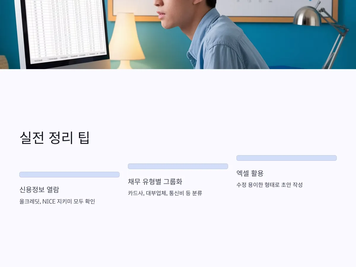 카드사, 대부업체, 통신비, 공공요금 체납 등 유형별로 그룹을 나누면 정리 및 문서화 시 훨씬 수월합니다.